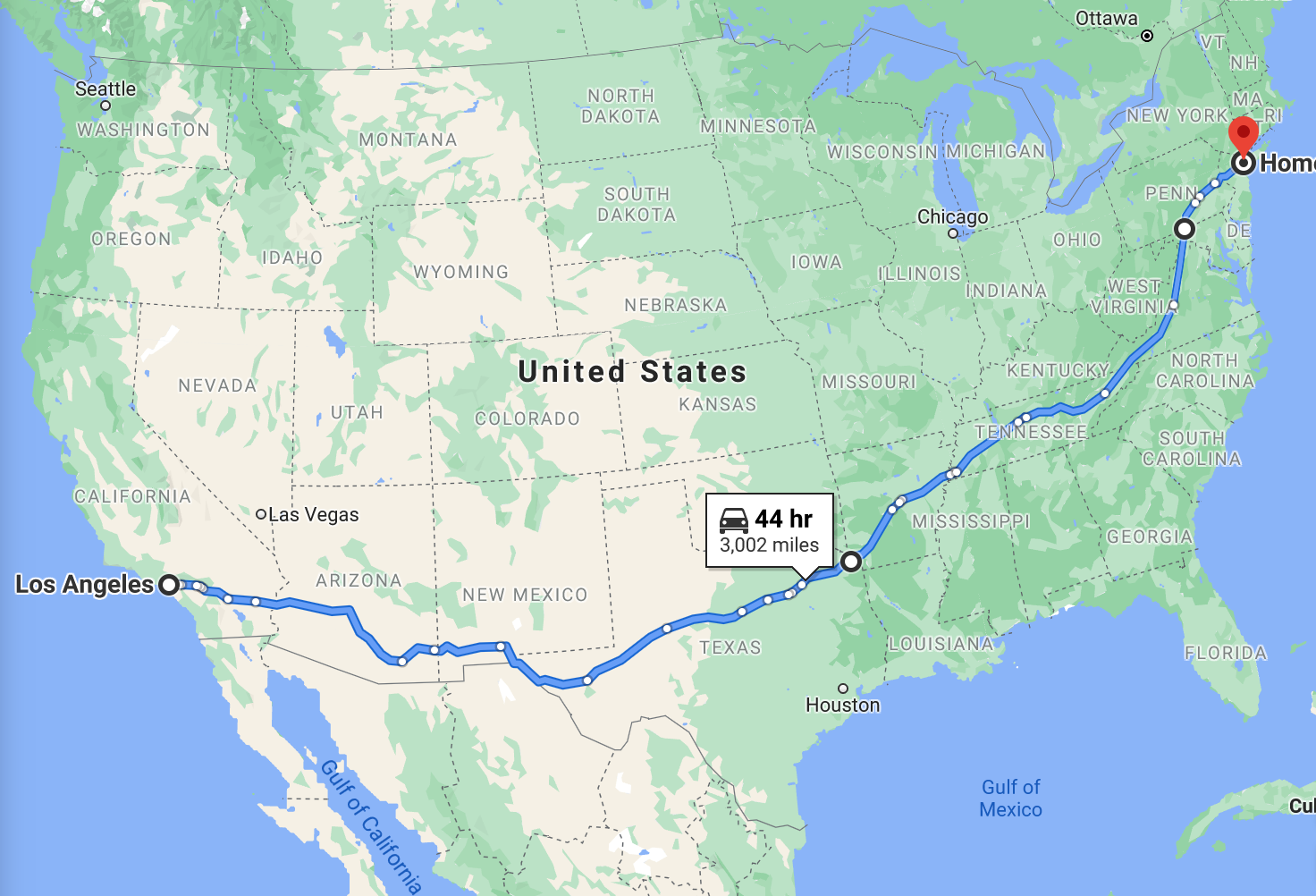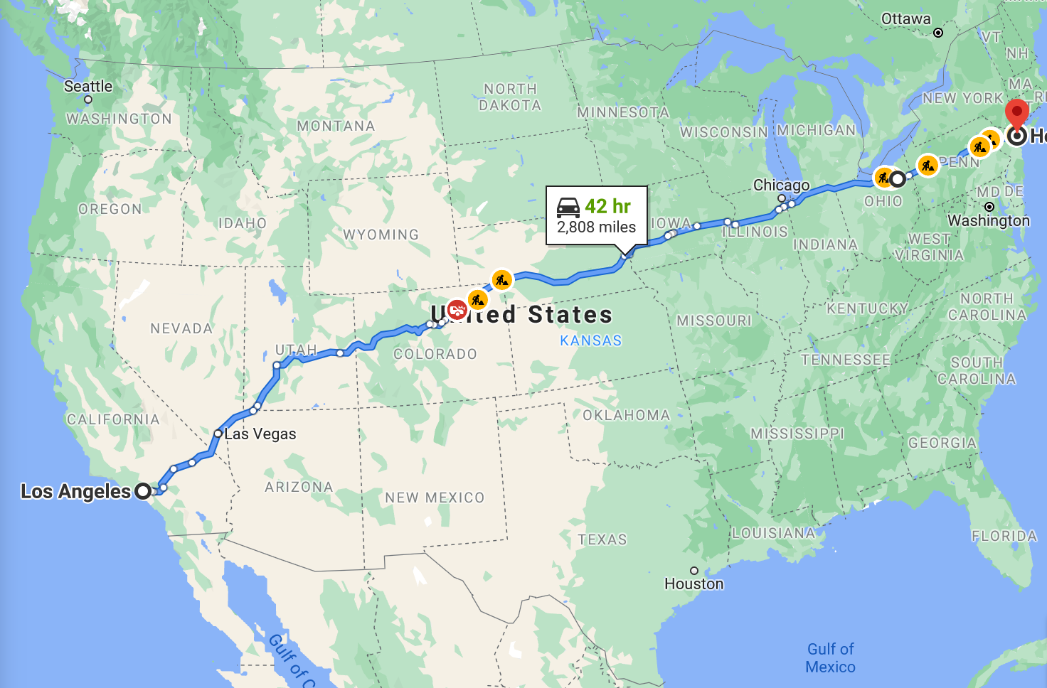 For the route back, I went central instead of southern, going from California to Nevada to Utah to Colorado to Nebraska to Iowa to Illinois to Indiana to Ohio to Pennsylvania to New Jersey to New York.