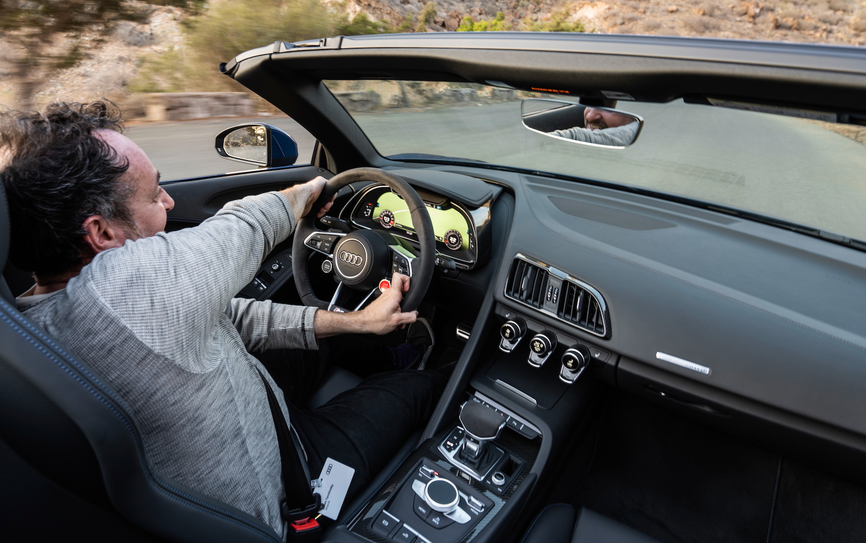 That screw-up aside, driving the RWD R8 on a track is immensely fun and satisfying. The naturally-aspirated V10 makes 562 hp and 419 pound-feet of torque, and it will get from parked to 62 mph in 3.7 seconds (add a tenth if you're in the Spyder, hair whipping around and your glasses flying off into the aether).