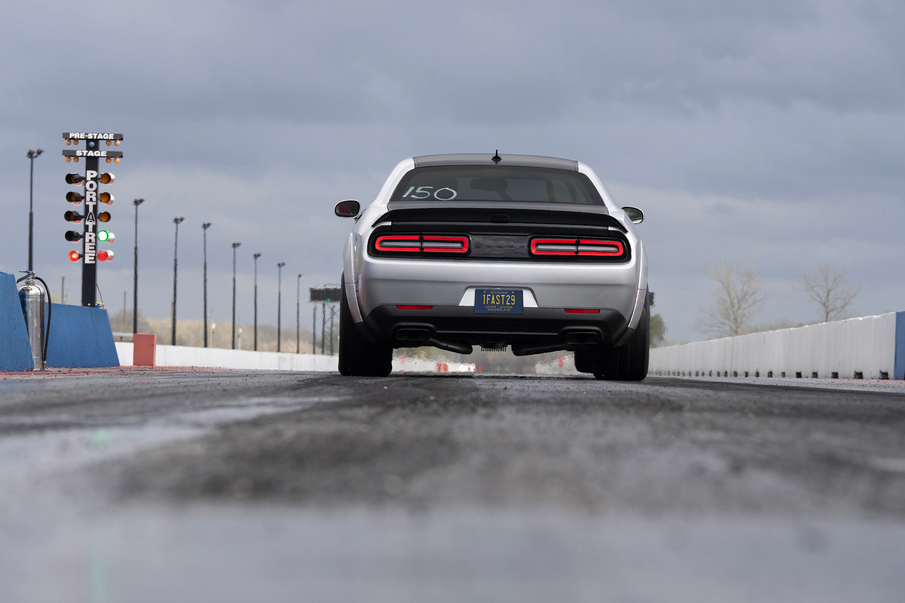 The Demon 170 is the first production car ever to wear Mickey Thompson ET Street R drag radials right from the factory — basically, drag racing slicks with just enough tread to be legal.