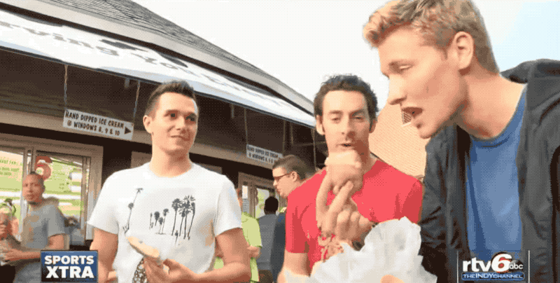 Josef Newgarden stuffs a whole grilled cheese in his mouth in one bite at the Indiana State Fair.