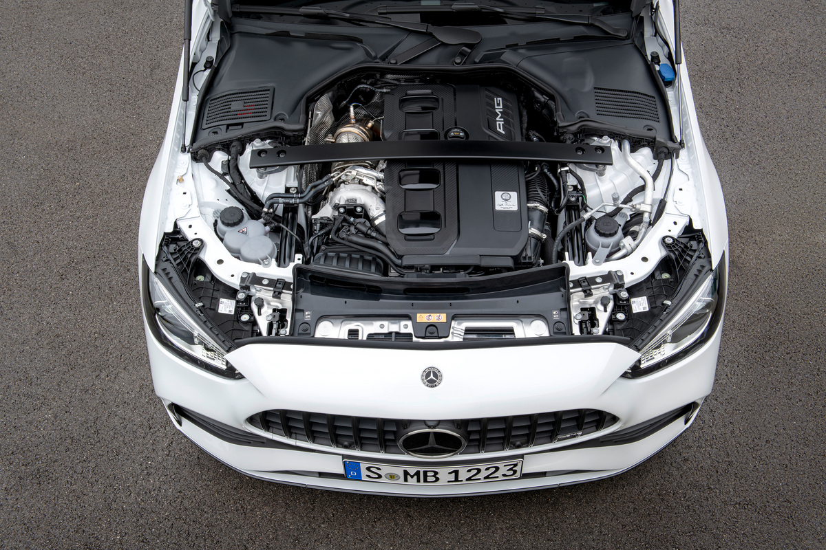 The AMG sport sedan uses an F1-inspired electric turbocharger to squeeze 402 hp and 369 lb-ft of torque from a 2.0-liter four-cylinder.