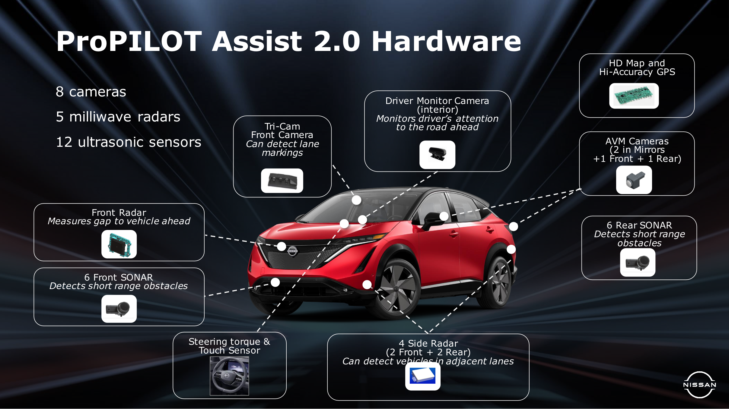 It wouldn't be an EV without a lot of tech, and the Ariya has tech in spades. Take ProPilot Assist, here upgraded to version 2.0, which equips the EV with a bunch of sensors and cameras. All those combine to allow Ariya to achieve Level 2 driver assistance, meaning hands-free driving, but you damn well better pay attention and be prepared to take over if needed.