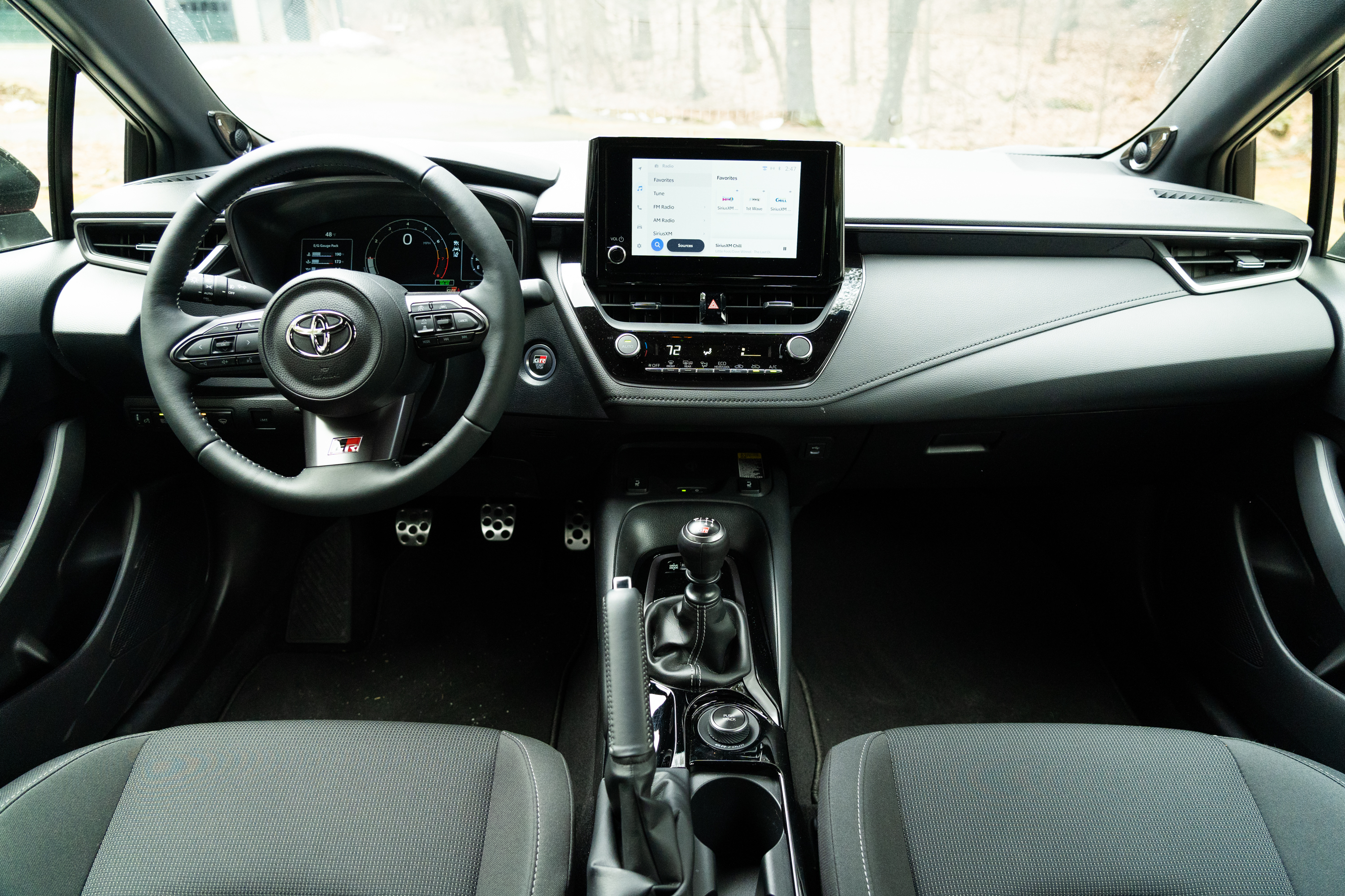 One foot on the brake, another on the short but firm clutch, then stab at the GR Start/Stop button. That little three-pot fires to life with, not exactly a roar but definitely an aggressive, bassy note. Triples have never been common, especially in sporty applications like this, and so it should come as no surprise that the GR Corolla sounds unusual.