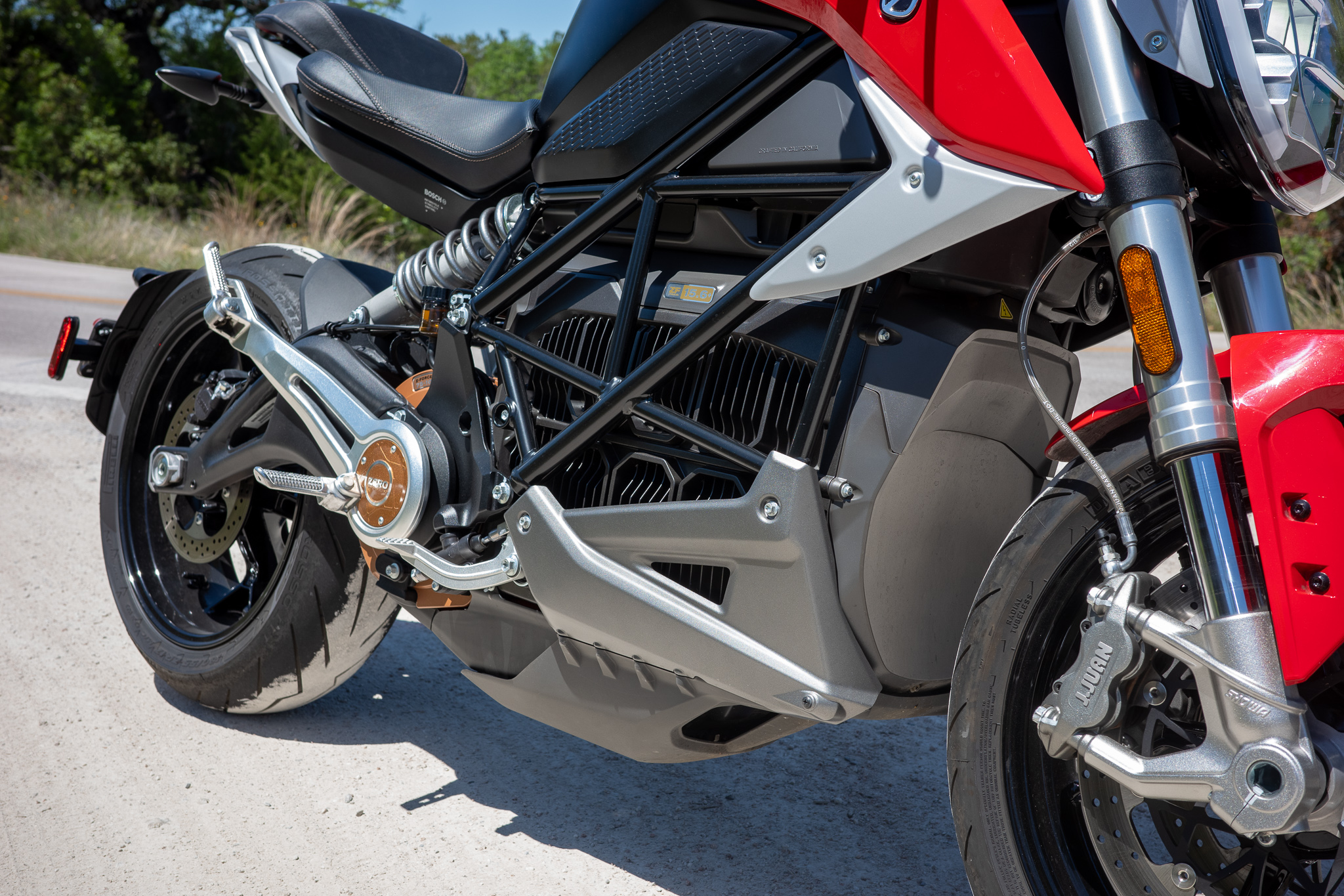 In a word, the drivetrain of the Zero SR/F feels hollow. The weight of the motor and battery pack sit near the rider's center of gravity, but there are fewer moving parts, so you're not fighting the motion of the engine. The power goes directly from the electric motor through the bike's carbon belt drive and to the beefy rear wheel.