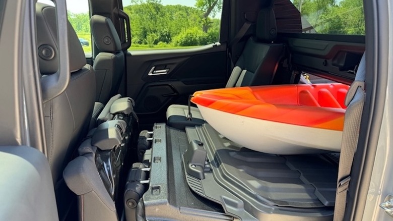 Range and other specs aside, I think the Silverado EV's biggest selling point will be the Multi-Flex Midgate, an evolved version of the feature pioneered by the Avalanche. In a couple of easy actions the rear seat base flips forward and the seatback folds down, with a 60/40 split across the rear bench. Then, with the press of a button, the wall below the rear window folds down, creating an opening for the bed to flow into the cabin. You can also flip a couple of switches to pop out the rear window and stow it within that wall, then allowing you to fold the entire rear Midgate section down (though this obviously can't be done with the split unless you put the window somewhere else).