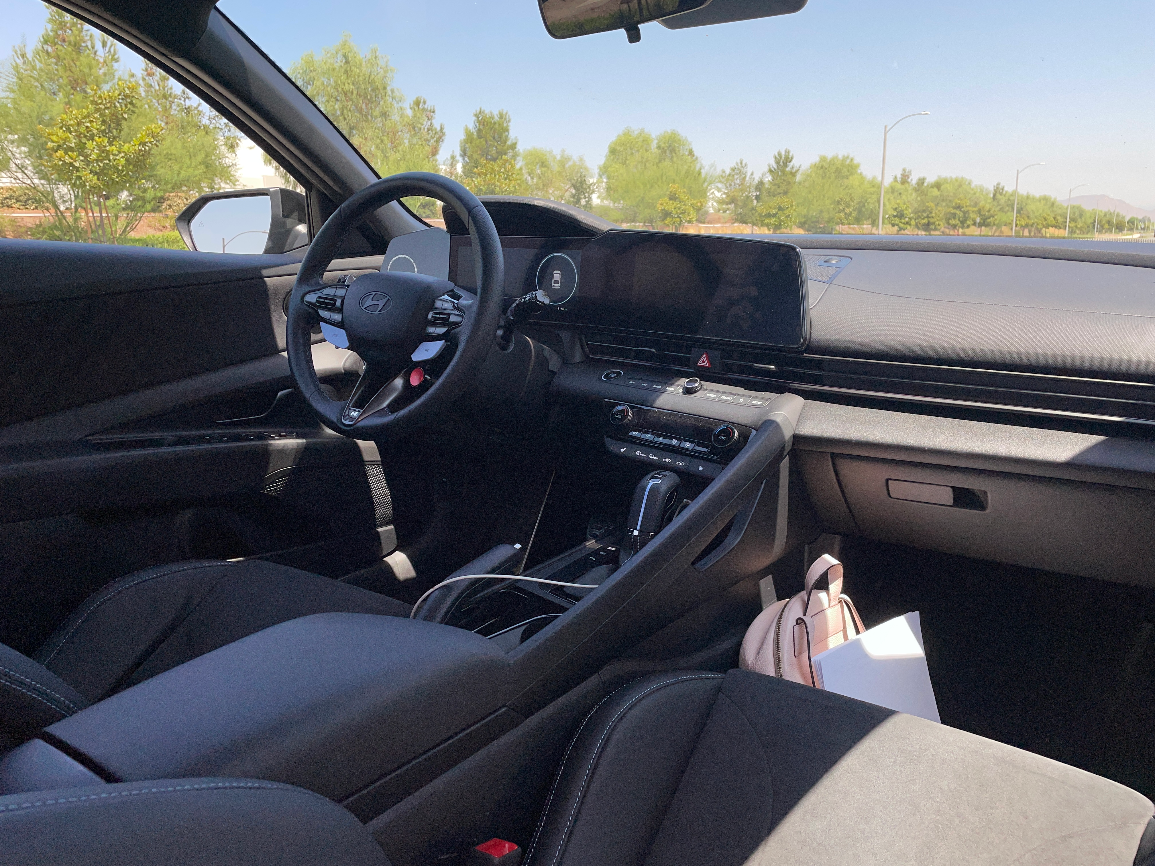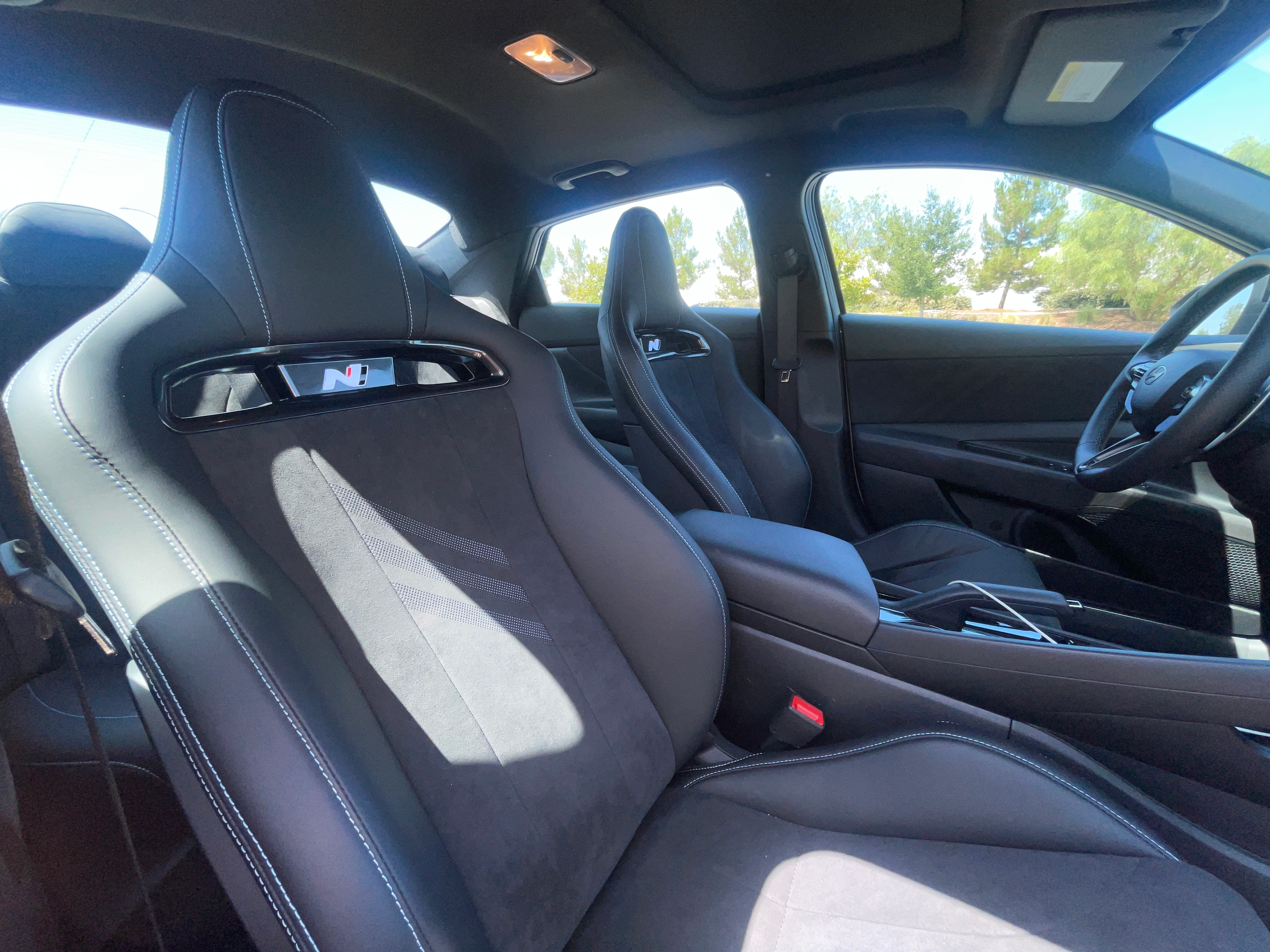 When the Elantra N isn't tearing up the hills or backroads, it's simply an Elantra with a nice and surprisingly comfortable driving experience. It's loaded with much more stuff than the highest trim of a regular Elantra, too. Fantastic looking and heavily bolstered heated leather and Alcantara sport seats have trick illuminated N logos, and they feel great. You get standard features like a sunroof (as long as you choose the eight-speed transmission; a sunroof isn't available with the six-speed manual), a Bose premium audio system, 64-color ambient lighting, a suite of driver safety aids and 20.5 inches of screens. Well, it's really two 10.25-inch screens, but it looks like one long screen.
