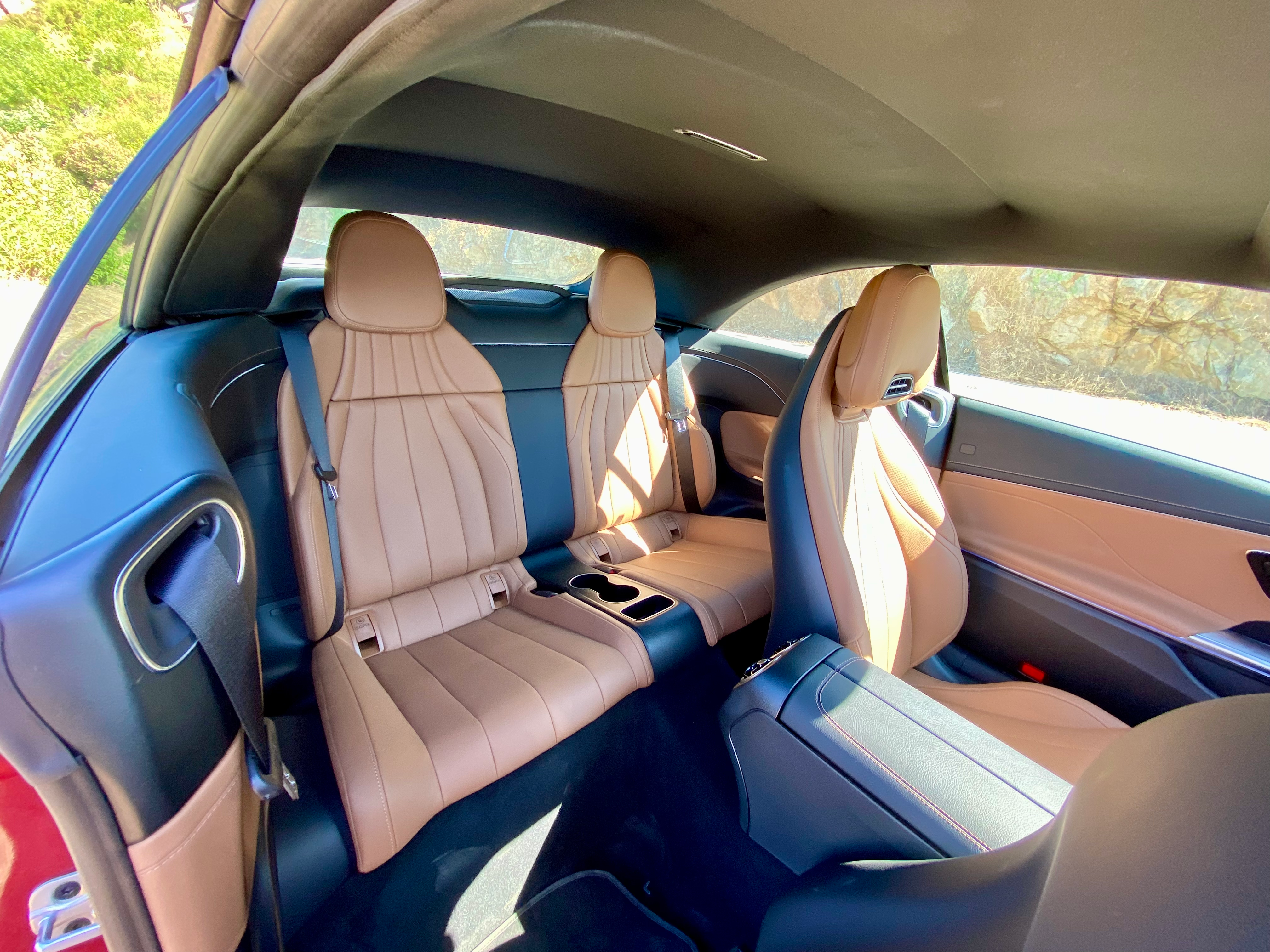 The CLE Cabriolet replaces both the C- and E-Class convertibles in the Mercedes-Benz lineup. Though it has a slightly shorter wheelbase than the E-Class cabrio, it's slightly longer than both outgoing cars. That means the CLE Cabriolet is the largest vehicle in its class, and it has two potentially usable rear seats as long as front seat occupants scoot up and/or rear seat passengers are shorter. The trunk space is compromised by the folding roof and small trunk aperture, but there's enough space and flexibility with the standard split folding rear seatbacks to carry what you need. Is it enough for a family of four to take on a weekend road trip? Probably not, but three will do just fine with some balancing of cargo space and seating capacity. The front seats enjoy heaps of space in virtually every dimension from legroom to headroom to shoulder room to manspreading room, the CLE is seriously spacious up front.