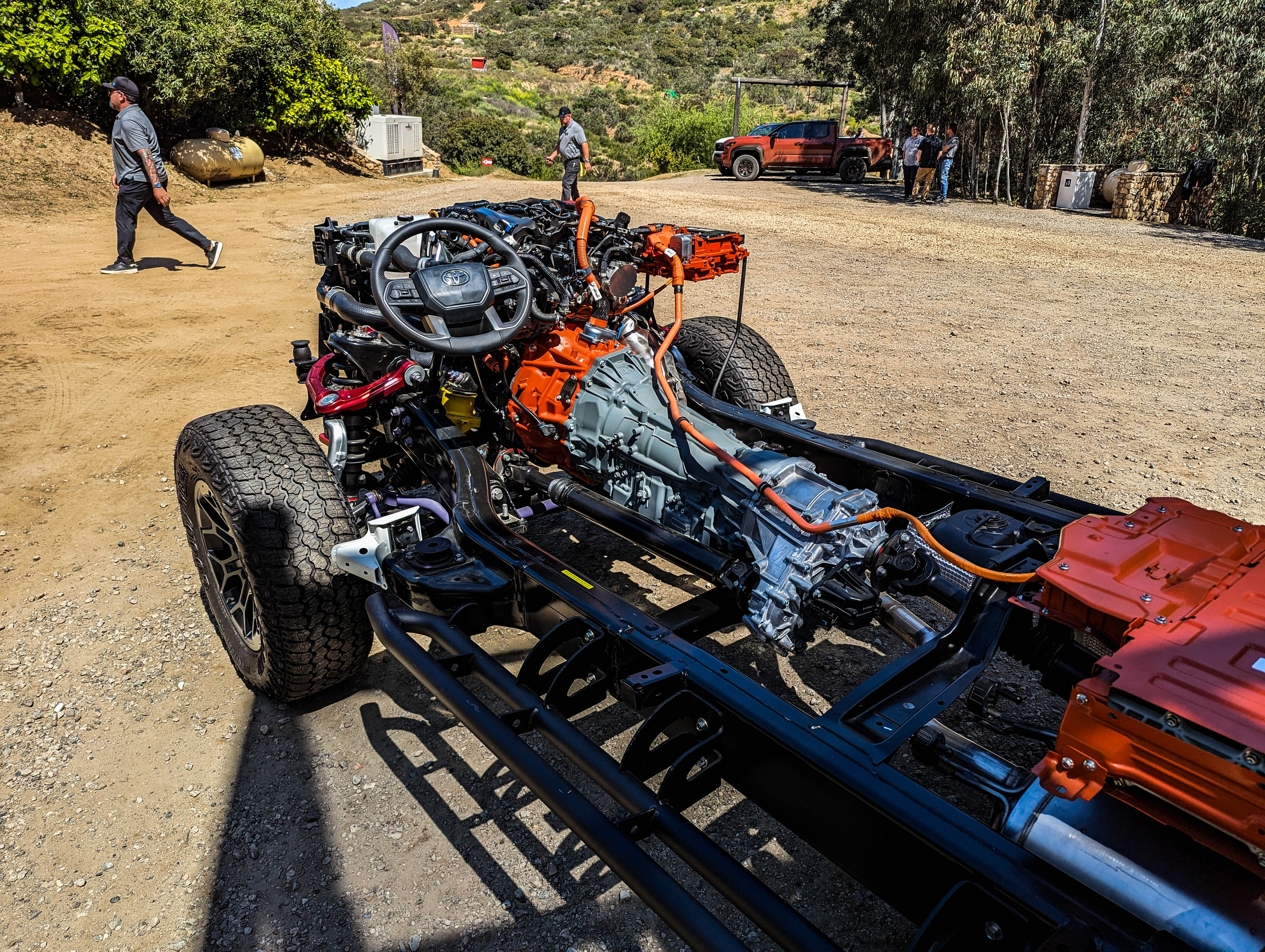 Toyota had us take the TRD Off-Road trim out on a course it called the "playground," which lived up to its name. This was a fairly straightforward off-road loop that featured massive elevation changes, sharp turns, and some simple rocky outcrops to offer a sense of what's possible for even the more base trims of these hybrid trucks. In addition to the features listed above, you can opt for an available front stabilizer disconnect mechanism that offers an impressive amount of suspension articulation, as well as an electronically locking rear differential, monotube Bilstein remote reservoir shocks, and an end stop control valve to increase damping force.