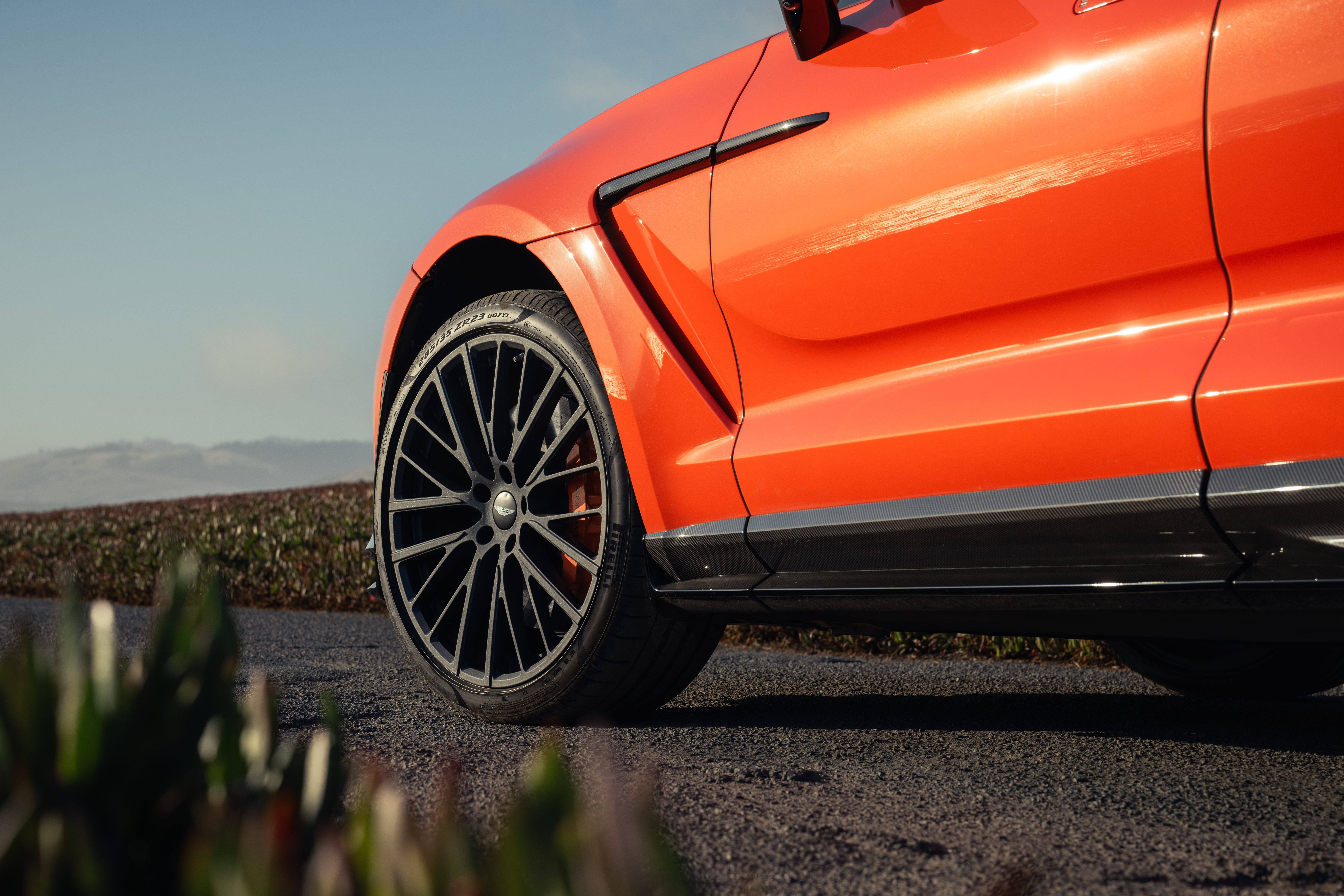 Gigantic carbon-ceramic brakes are standard, and they do an excellent job of bringing the 4,940-pound DBX707 to a stop without any fade or squeaking. Pedal feel is pretty linear, with less of an aggressive tip-in than most other cars with carbon brakes. 22-inch wheels are standard but the DBX I'm driving is equipped with a $7,200 set of 23s wearing Pirelli P Zero summer tires that provide tons of grip but a choppy ride on rougher pavement. The thick-rimmed steering wheel (that's no longer weirdly shaped) relays a lot more feedback than is typical of an SUV, with a direct and quick rack.