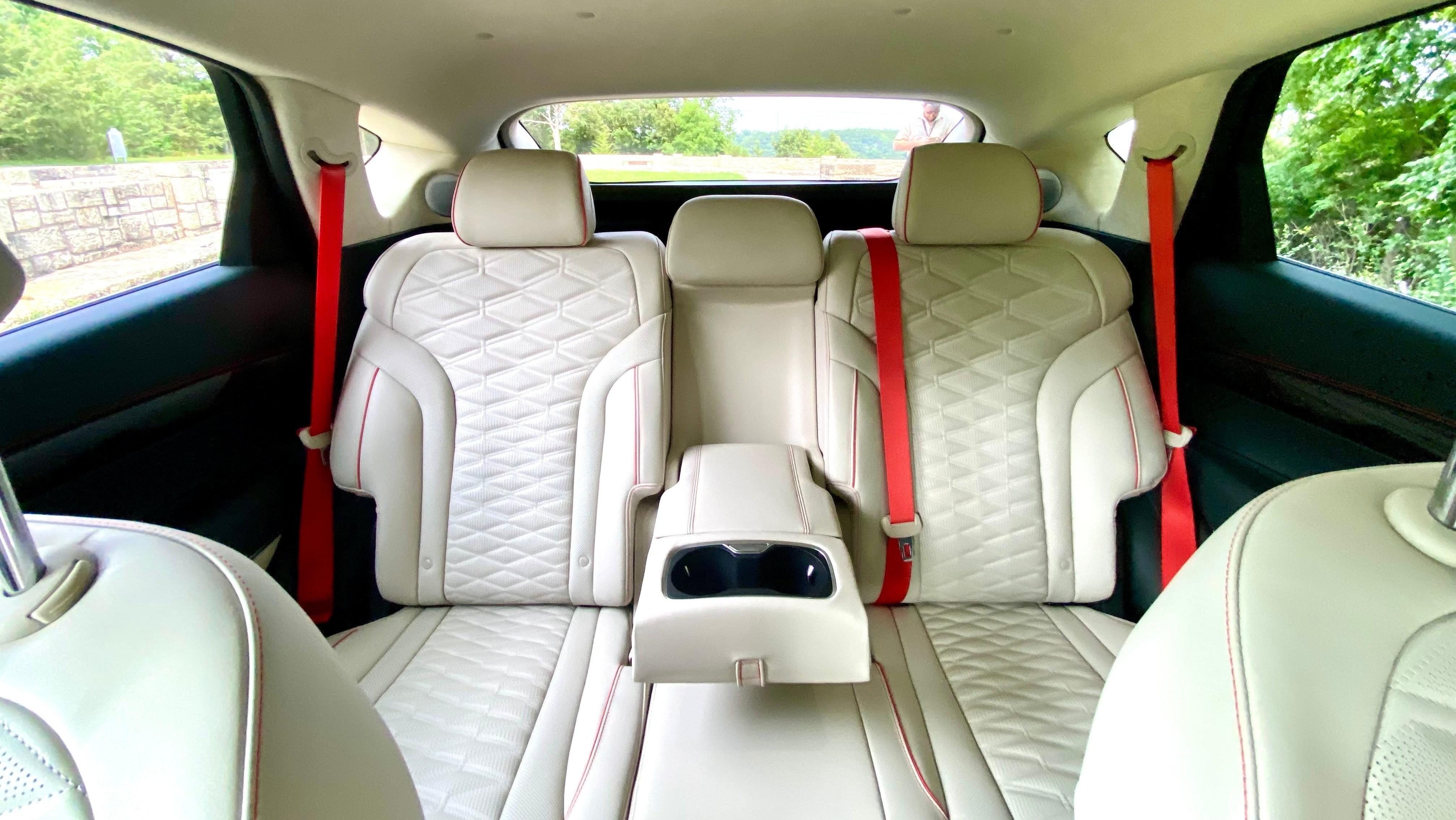 On the outside, Genesis is offering the GV80 Coupe in a new color called Bering Blue, which is really a gray that's hardly blue at all. Inside, the Coupe gets more exciting color combinations including Ultramarine Blue with orange stitching, Smoky Green and Vanilla Beige, and Obsidian Black with Sevilla Red accents. My test car had the orange seat belts, which sound tacky but work oh-so-well. Virtually every surface I touch inside the GV80 Coupe is covered in premium materials, from the suede headliner all the way down to the insides of the back seat door pockets. The interior is a lovely place to be overall.
