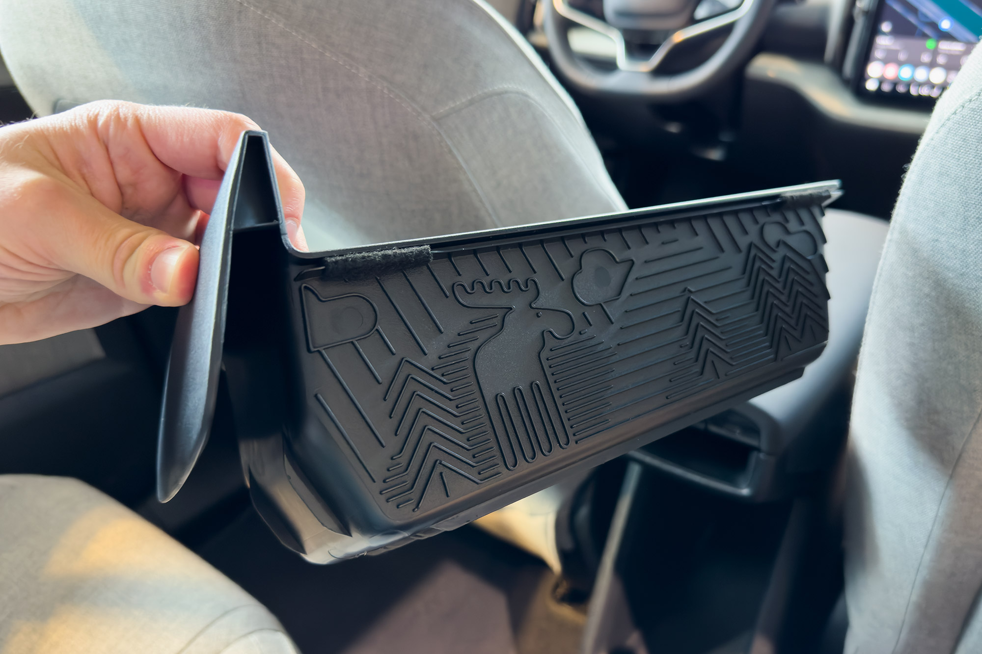 Instead, Volvo will direct you to a removable bin below the center console. That could work for laying a water bottle down flat, but it's not going to do you any good in a cup-plus-lid situation. I feel like a fold-out armrest concealed in the center seat could've worked well here.
