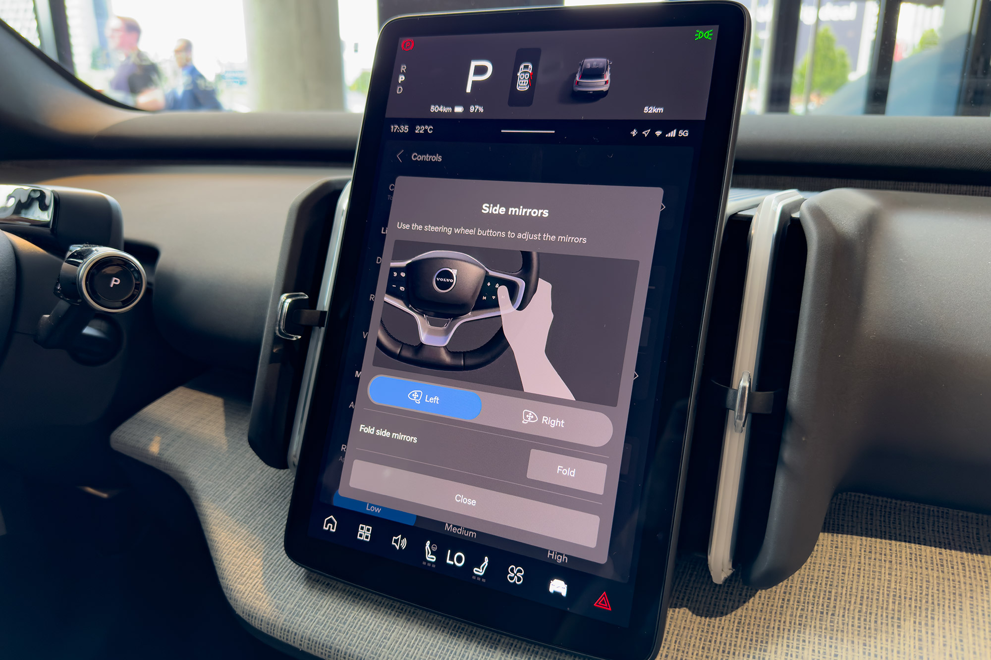When the time comes that you want to adjust the side mirrors in your EX30, you don't flick a separate switch or joystick. Remember: this car's M.O. is cutting down on that kind of stuff. Instead, you go into the Controls section of the Settings menu in the infotainment system, select the mirror you want to move and then use the capacitive buttons on the steering wheel to shift it side to side or up and down.