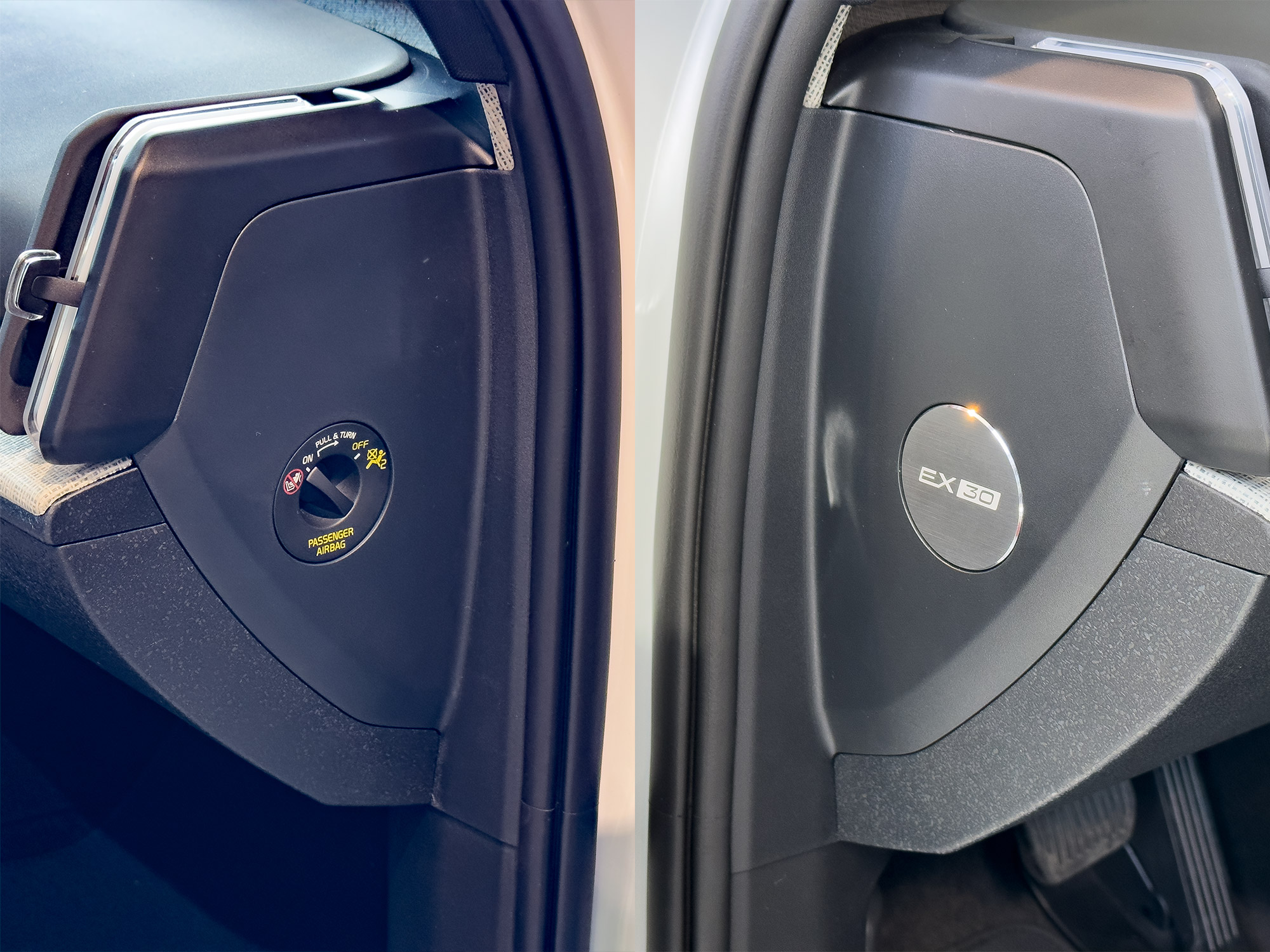 This has an interesting knock-on effect if you pay special attention to the passenger airbag control switch, which is mounted on the side of the dashboard and is only visible when the front passenger door is open. On the driver's side, Volvo covers this spot up not with a blank plastic disc, but one adorned with a chrome rim and the EX30 logo. Expect these to switch places on U.K.-bound examples.
