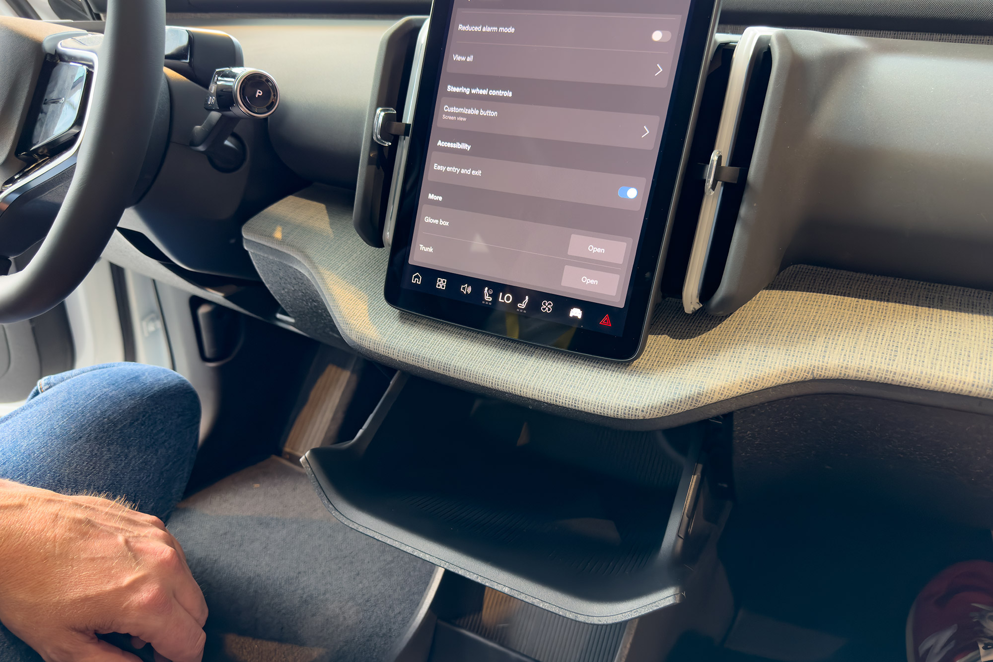 One of the things you quickly notice about the EX30's interior is that it's very symmetrical. This is ostensibly done to keep costs down, as it means Volvo needs only to move the steering wheel and pedals when modifying the car for right-hand-drive markets.