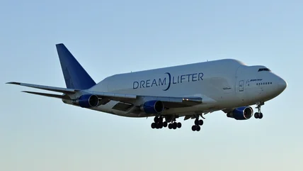 This converted 747-400 was built during the 2000s decade to transport large aircraft segments between Boeing's manufacturing centers worldwide. It can carry components as large as fuselage sections and wings in its immense cargo hold, which is three times the size of the hold in a standard 747 cargo plane. Its payload capacity is 47 tons.