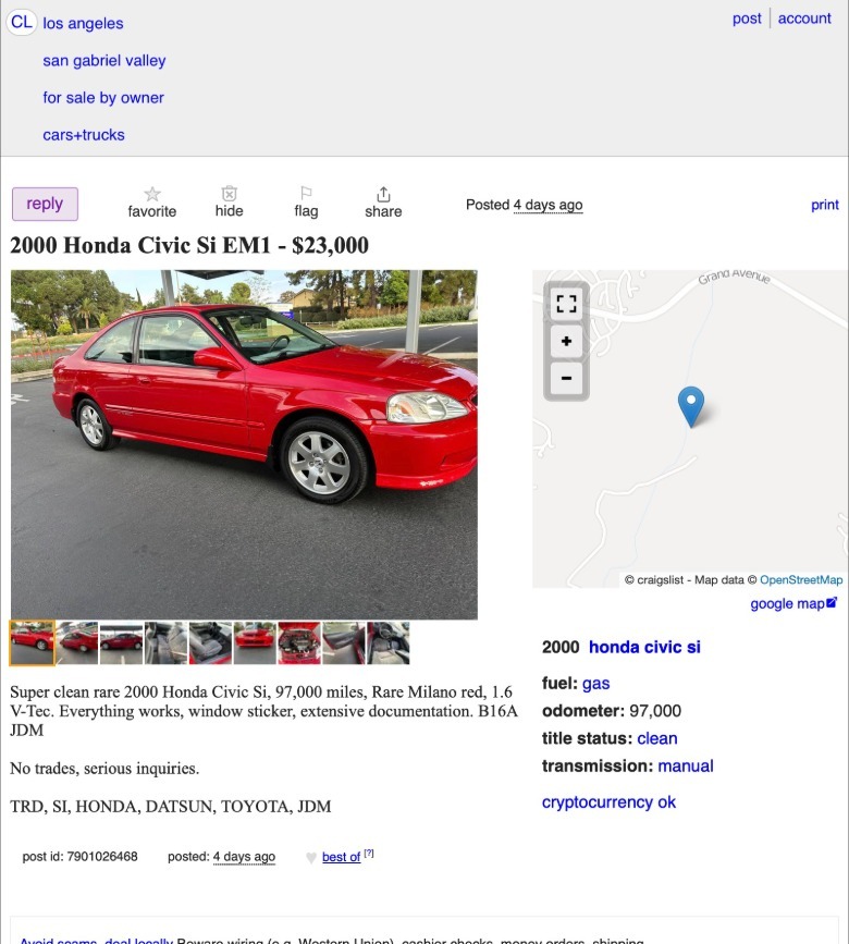 What's your take on this nice Si and the $23K asking price? Does that seem fair given the car's condition and the market's lust for these models? Or is that just crazy talk?
