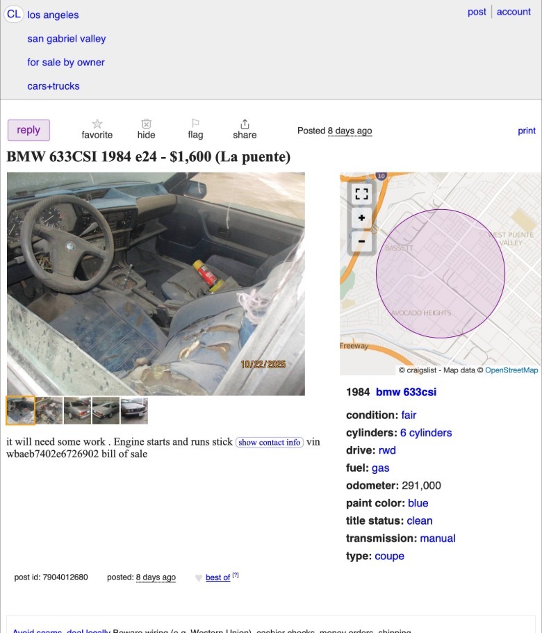 What do you say? Is $1,600 a fair price for a classic BMW coupe that needs pretty much everything? Or is that too much to tackle the expense, workload, and potential Hantavirus risk this Bimmer entails?