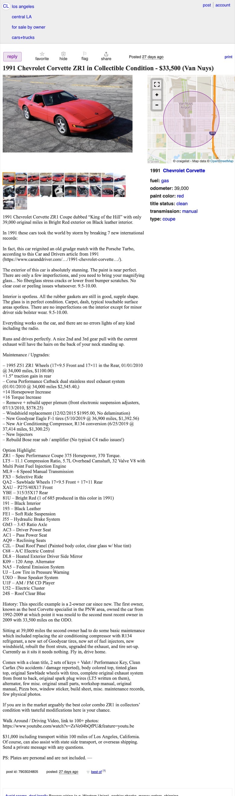 According to the ad, the ZR1 comes with a clean title, two sets of keys, two tops (body color and smoked), the original wheels/tires and exhaust, and a bunch of other bits and bobs. Also included are the original build sheet and Monroney sticker, plus some miscellaneous maintenance and repair records. Not included are the California blue and gold vanity plates that read "I MAILEM." The asking price for the kit and caboodle is $33,500.
