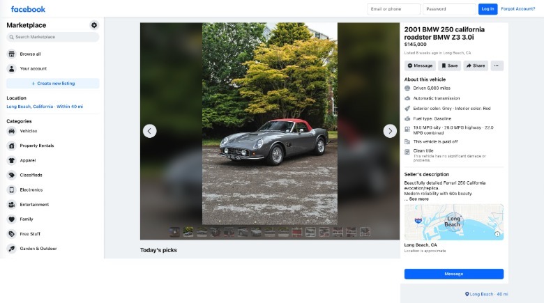 Our car is described in its ad as a hand-crafted "evocation" of a 1960s Ferrari 250 California SWB. That homage has been built on the chassis of a 2001 BMW Z3 roadster, giving it, in the seller's words, "Modern reliability." I'm guessing they aren't fully versed in the actual reliability of 25-year-old BMWs.