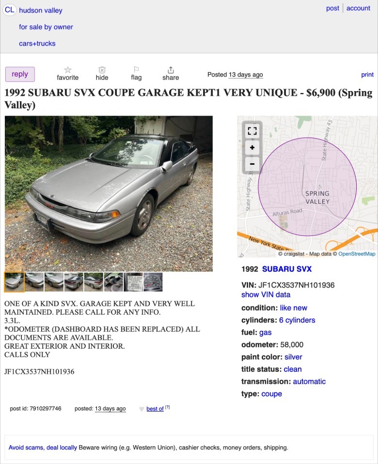 The only transmission that Subaru had on hand at the time that could handle the EG33's output was a four-speed automatic, making the SVX more of a cruiser than a bruiser. According to the ad, this car has been garage-kept and well-maintained, but the description presses interested parties to call for more info on its condition than that.