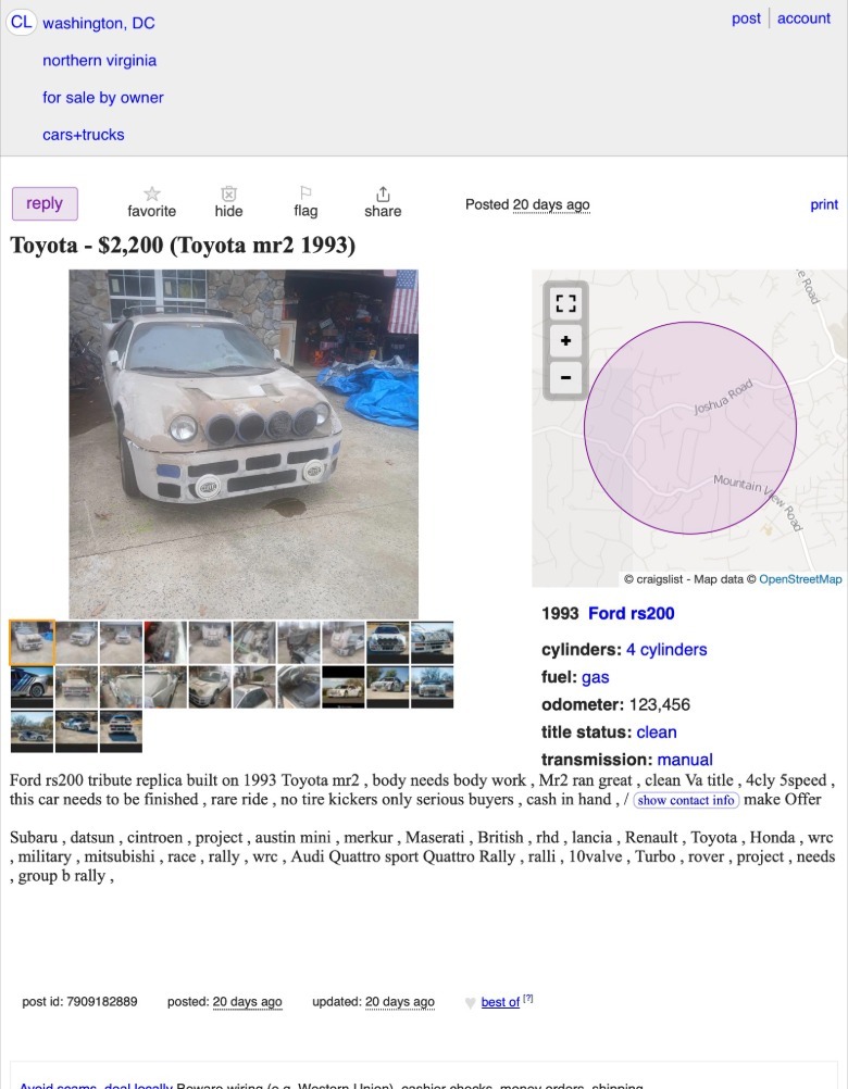 Today's Nice Price or No Dice MR2 asks us to suspend disbelief and also, for its next owner to roll up their sleeves and put in the sweat equity required to finish this remarkably-conceived Ford RS200 rally car homage. Let's see whether that's all worth what the seller is asking.