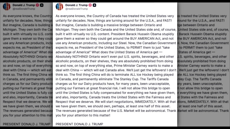 Trump called the bridge a priority in 2017, but now he's blaming Obama for giving Canada a waiver around the Buy American act (which didn't happen, since the Buy American act only applied to U.S. federal agencies) and rages at Prime Minister Carney for bringing Chinese EVs into the country.