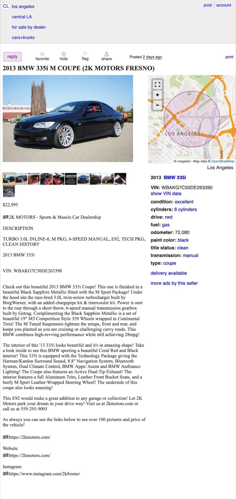 Because it's a dealer car, we can expect to pay a bit of a premium, seeing as the seller is responsible for all the title transfer shenanigans and the smog certificate. We now need to consider whether this 335i's $22,995 asking price is too steep a premium.