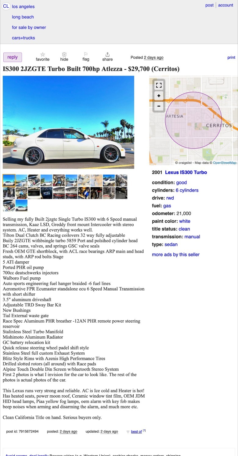 While we've been told that a picture is worth a thousand words, it's really in the ad's description that the work undertaken on this car begins to shine. It's also full of fun acronyms like 2JZGTE, ARP (head bolts), ACL (bearings), and, as a grand finale flourish, "OEM JDM HID head lamps."