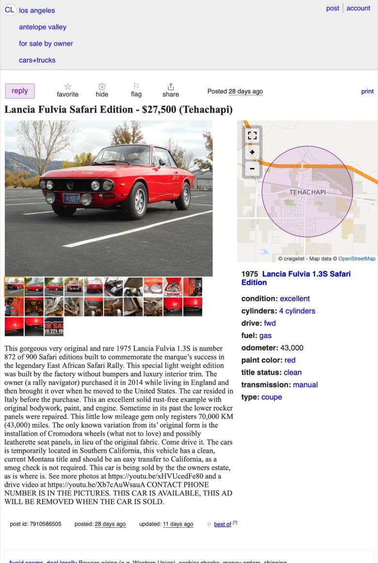 The question for us is whether it is worth the $27,500 the estate is asking for its sale. What's your take on this once fabulous Fulvia and that asking price? Does $27,500 seem like a fair deal to go on a Safari? Or is that too much for a once but not a future king?