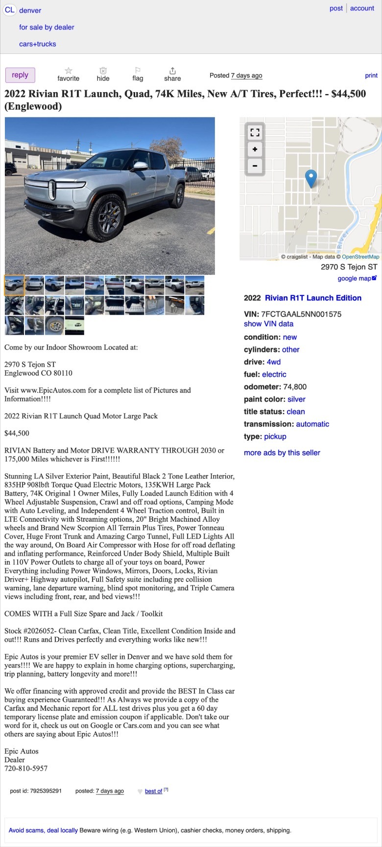 This truck looks to be in excellent condition both inside and out, and unlike Tesla, which tends to favor a somewhat parsimonious interior look, Rivian's cabins come across as a bit more upscale and luxurious.