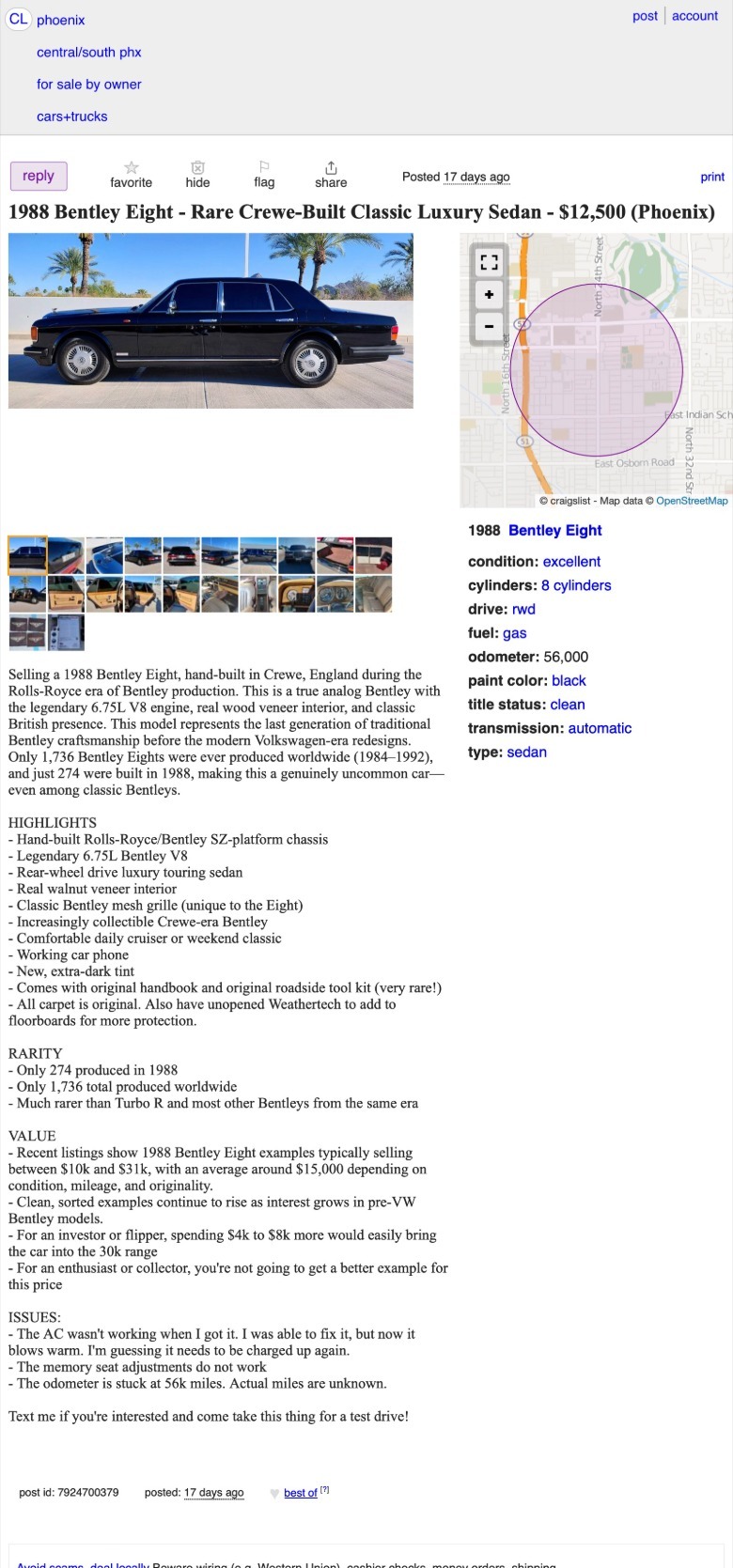 A clean title and current Arizona registration complete the picture on this Bentley. The seller boasts of the car: "For an enthusiast or collector, you're not going to get a better example for this price." We'll just have to see about that.