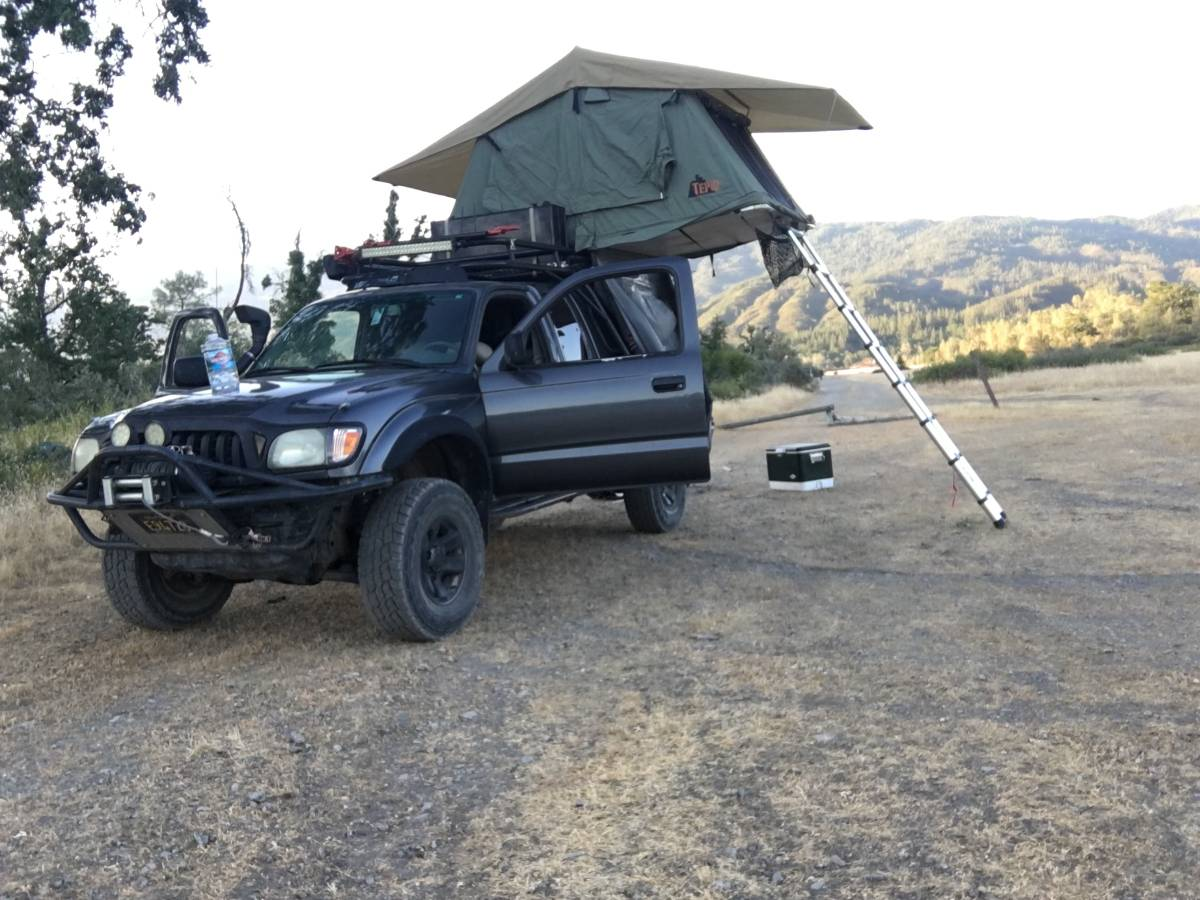 As a bonus, this Taco is even equipped with a stick shift. Sure, there's the small question of the salvage title, but the Toyota seems to be holding up to rooftop tent use — how bad could it possibly be?