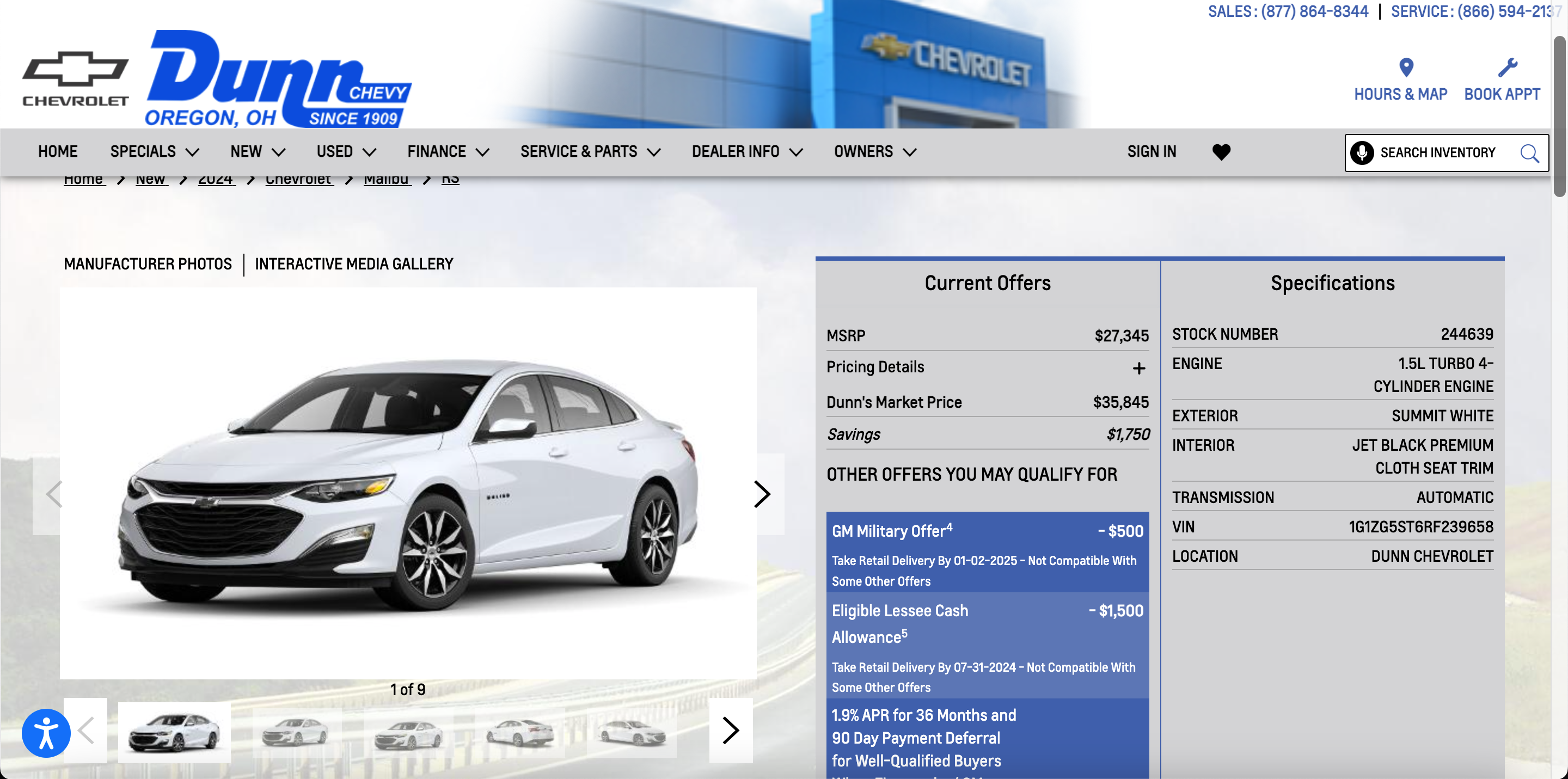 The Chevy Malibu is the last holdout of Chevy's sedans. It's due to end production this fall so you'd think dealers would be trying to clear out the ones that they have left. Not so with Dunn Chevrolet in Oregon, Ohio. They have a 2024 Malibu RS on the lot with an MSRP of $27,345. You'll end up paying nicely equipped Accord and Camry money for this one though: $35,845.