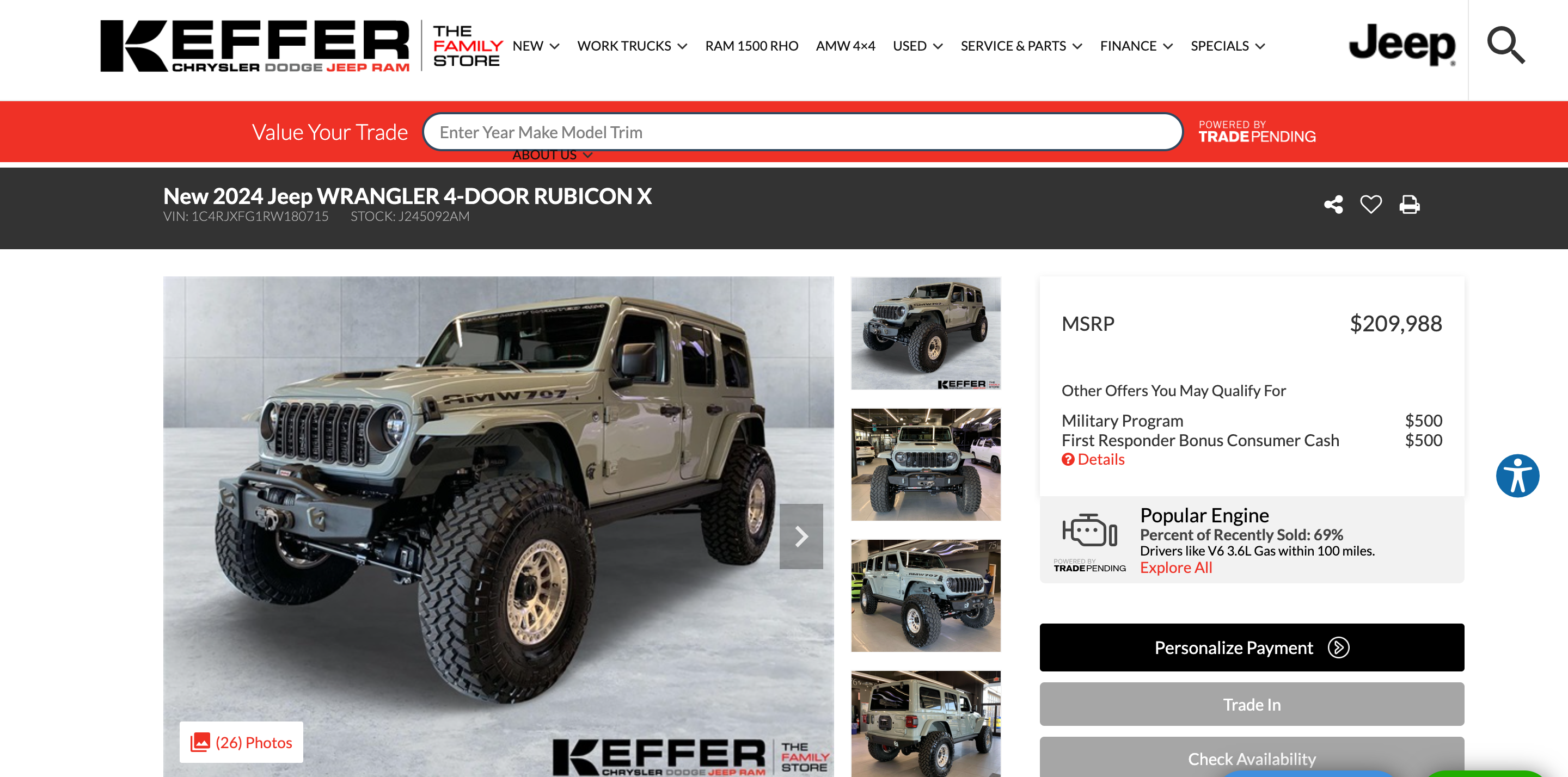 Want a Jeep Wrangler with some dealer's shitty bro mods tacked on? Keffer Jeep in Charlotte, North Carolina has the perfect vehicle for you. They took a 2024 Wrangler Rubicon X with a $75,280 MSRP and took it to America's Most Wanted 4X4 and went wild. The result is a Wrangler with a bunch of shit no one asked for and a $209,988 price tag.