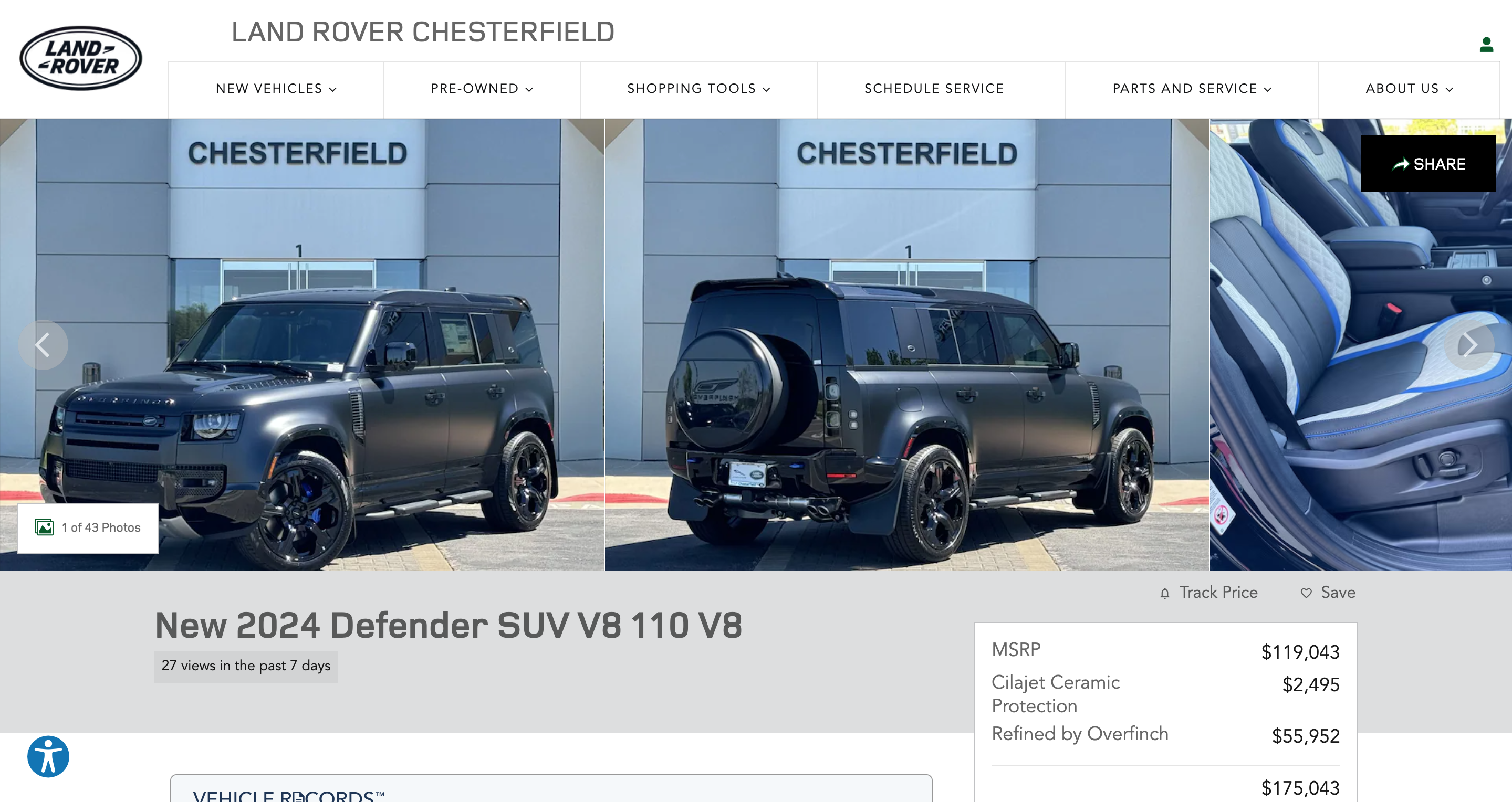 The Land Rover Defender V8 is the ultimate Defender. It also has the ultimate price tag. Marking one up to be even more expensive is wild but that's what Land Rover of Chesterfield, Missouri is doing. Its taken a Defender 110 V8 with an MSRP of $119,043 MSRP, tacked on another $2,495 for some bullshit ceramic protection and then added another $55,952 is added on for a bunch of accessories from Land Rover/Ranger Rover tuner Overfinch. The result is a $175,043 Defender.