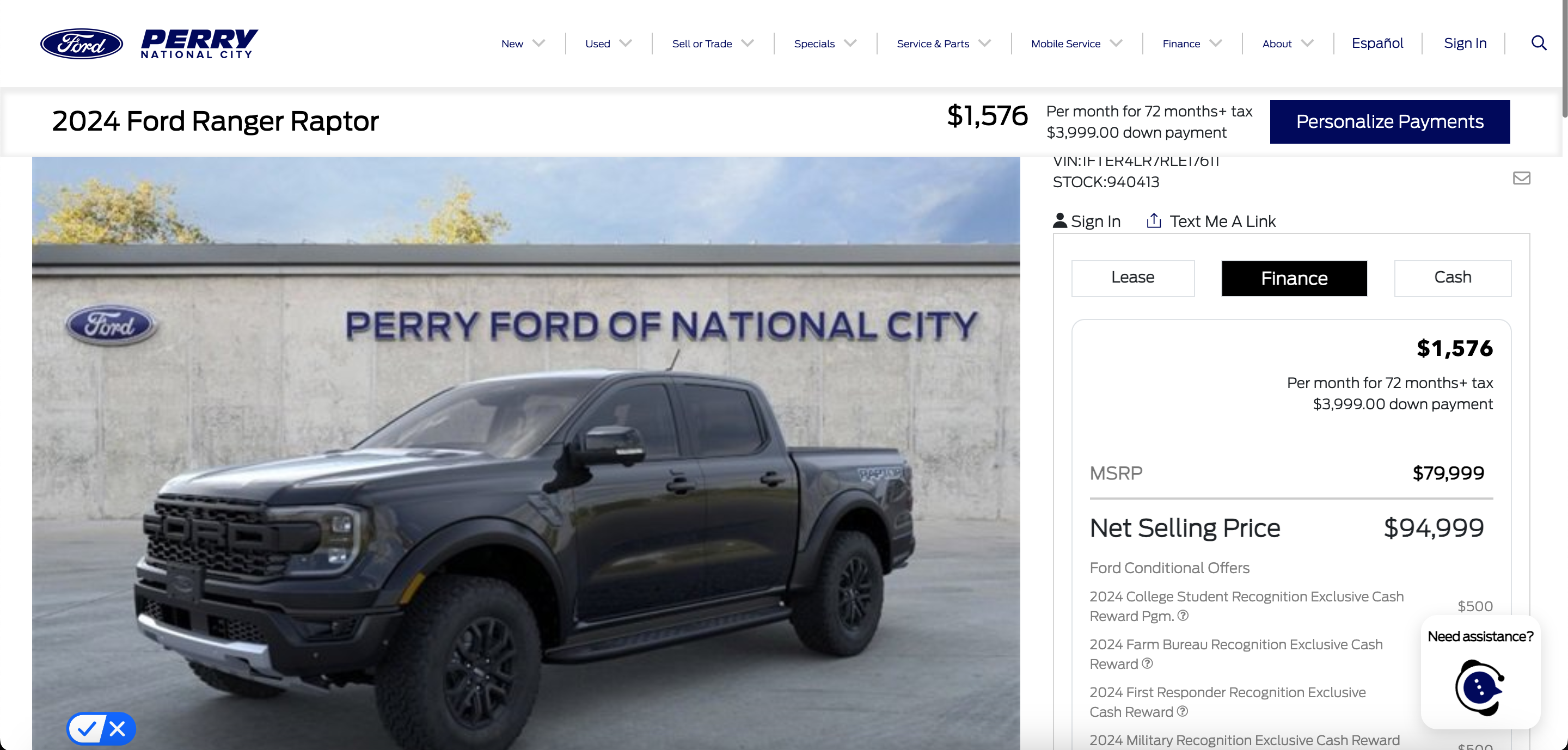 I don't think I've seen a Ranger Raptor on the road yet and pricing like this is probably why. Perry Ford in National City, California has a single Ranger Raptor in its inventory. Even though the listing says this truck has an MSRP of $79,999, it's wrong. Checking the window sticker, you'll actually see it has an MSRP of $57,160. Any way you go about it, near six figures for a Ranger Raptor is criminal.