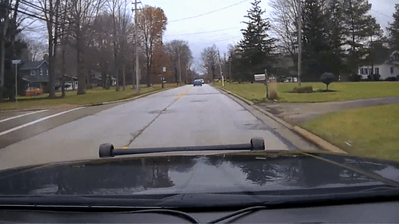 You can see the Fusion try to avoid the strips in this dashcam video shared by Cleveland's News 5 at around the 1:41 mark. You will not see the actual crash, but you can see the moment the Fusion swerved and lost control, and you can very notably hear the crash behind the squad car.