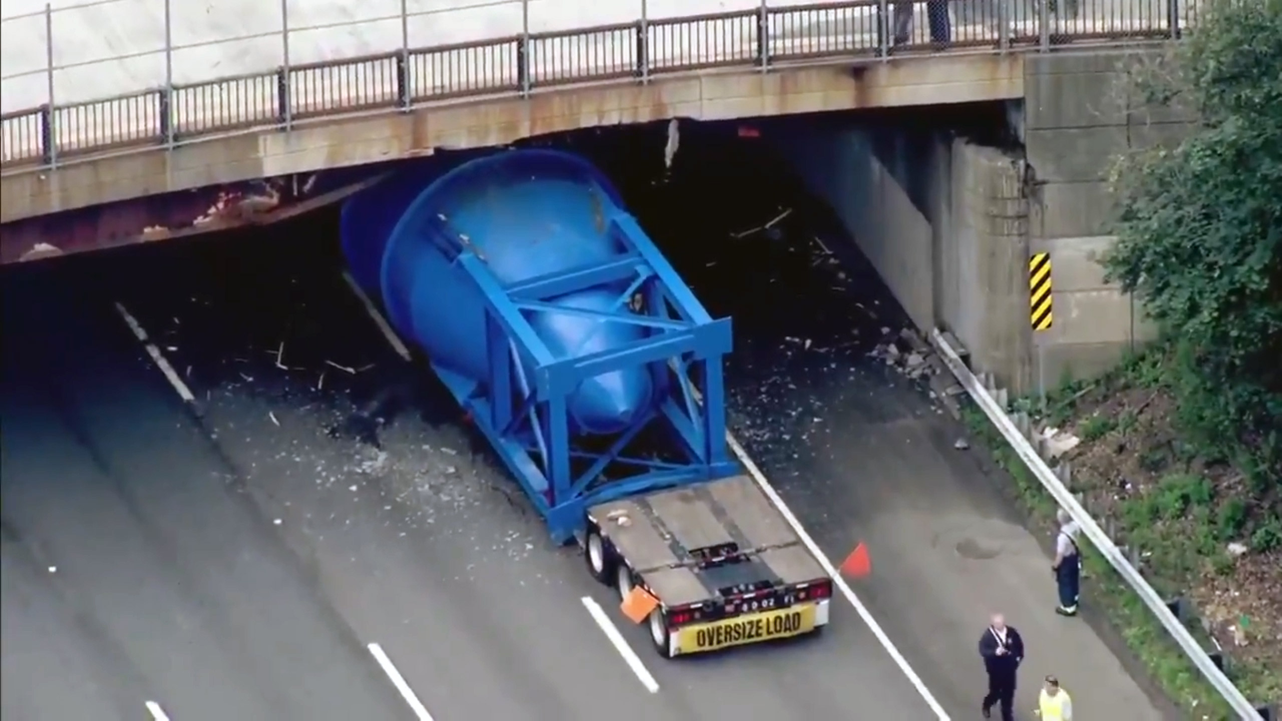 The curve of the bridge suggests the driver might've had better luck traveling in the left-most lane, though even that's hard to say given that this wasn't the kind of low-bridge incident where the margins were just slight enough to merely shave the roof off a passing truck. There was no way this unidentified blue thing was getting through without a fight.