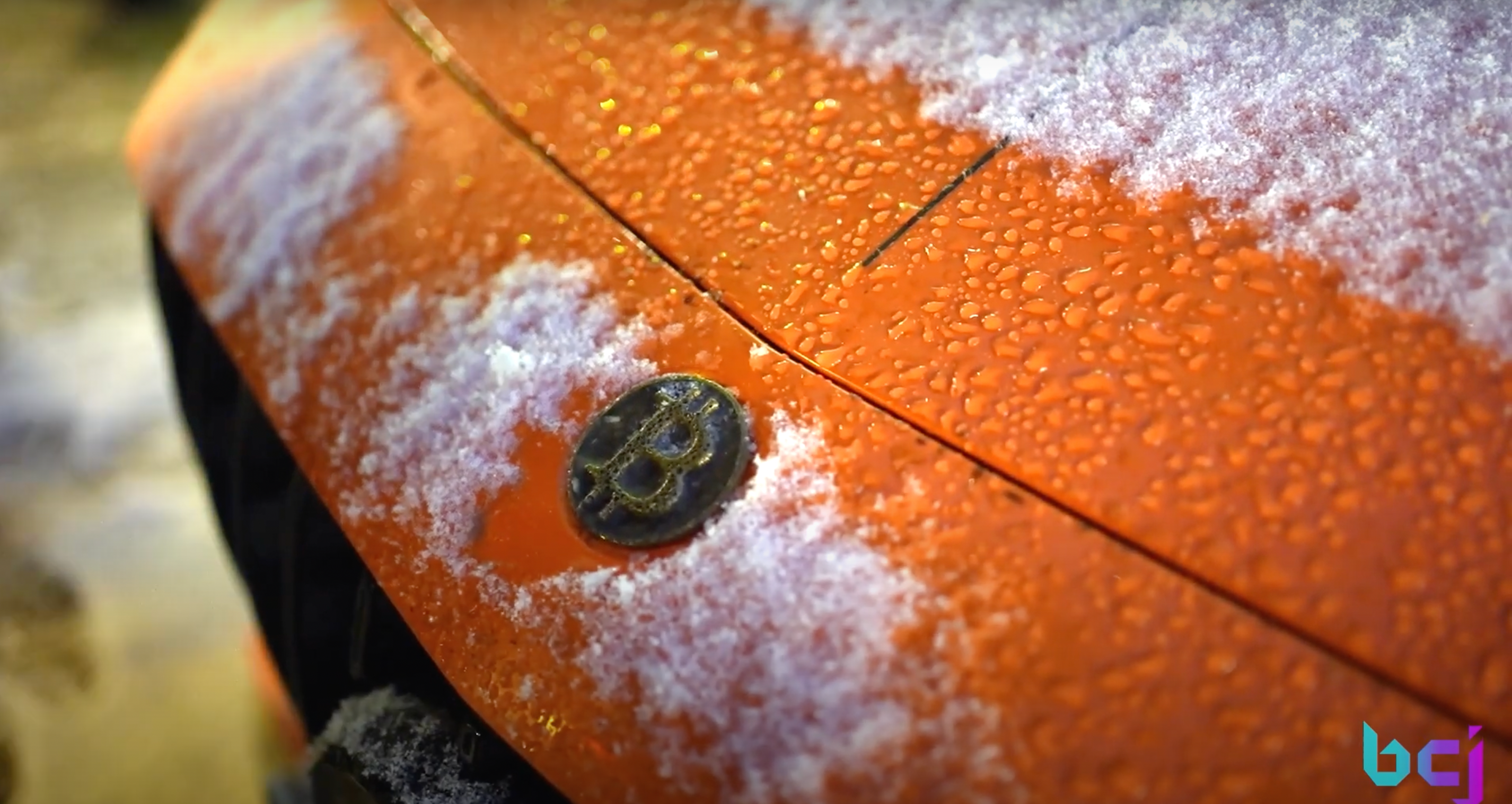 The Mercedes bears a Bitcoin badge with tires stamped with "In Crypto We Trust."