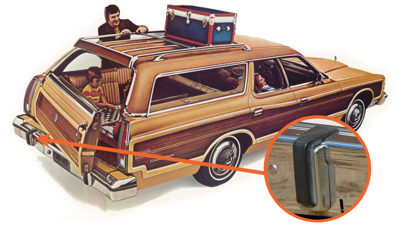 When I was a little kid, the two cars my family had were a 1968 Volkswagen Beetle (Semi-Auto! And I've written about how important it was to me before) and a 1973 Ford LTD Country Squire, a massive, fake-wood-paneled station wagon. I liked that big-ass Squire, but there's three things I remember about it most vividly: the surprising number of little trios of cats on it, the way the power windows never seemed to work, and, what I'm thinking about now, the fantastic rear bumper guards that were also useful little steps.