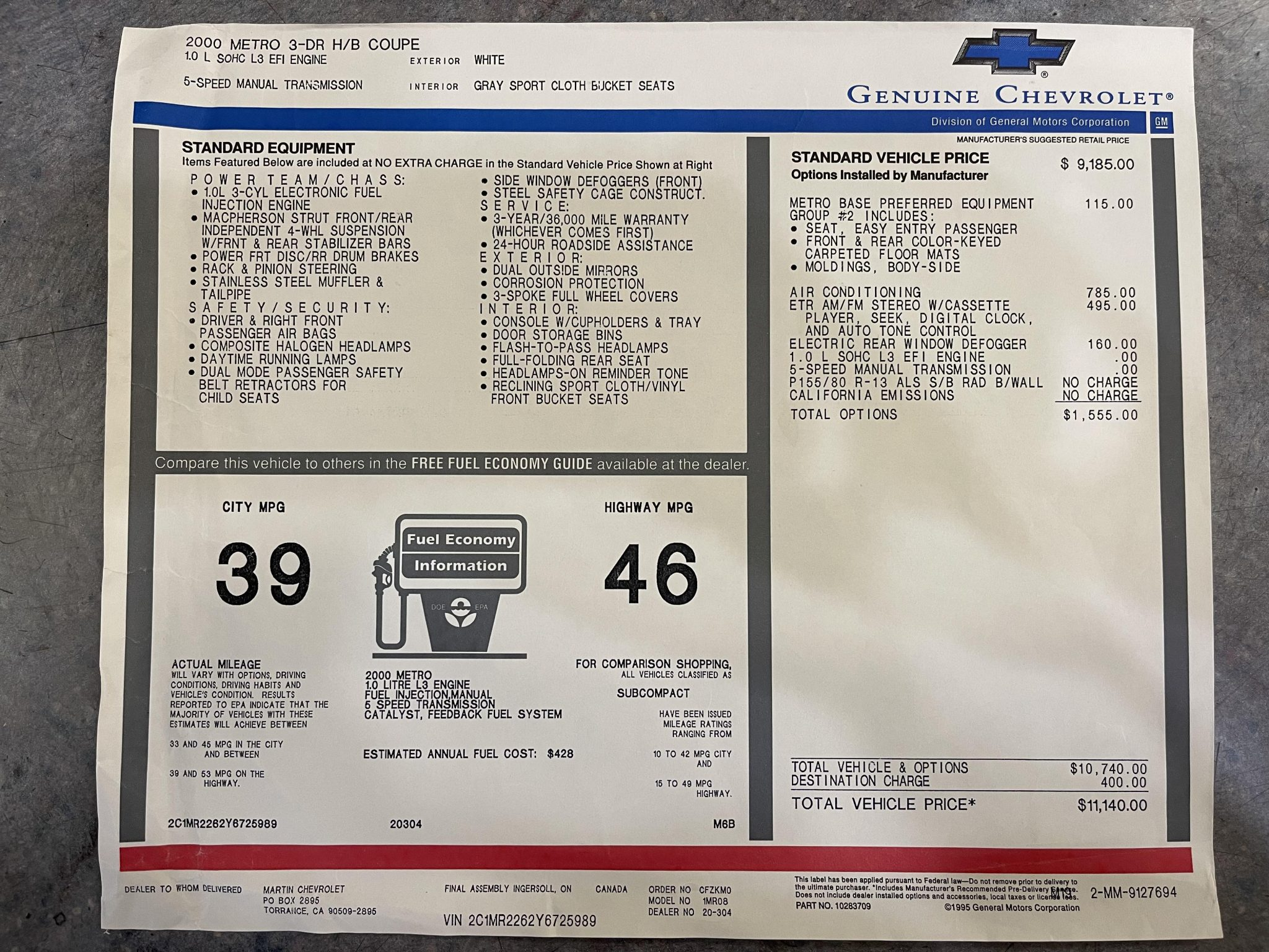 The ad states that the Metro was sold for $11,140, and there's a window sticker to prove it. If we adjust that price to 2021 dollars, it comes to $17,745 in today's money, which is $455 less than what this thing went for on Bring a Trailer. That difference is about what a beat-to-shit 2000 Metro would have sold for a year or two back on Craigslist, too.