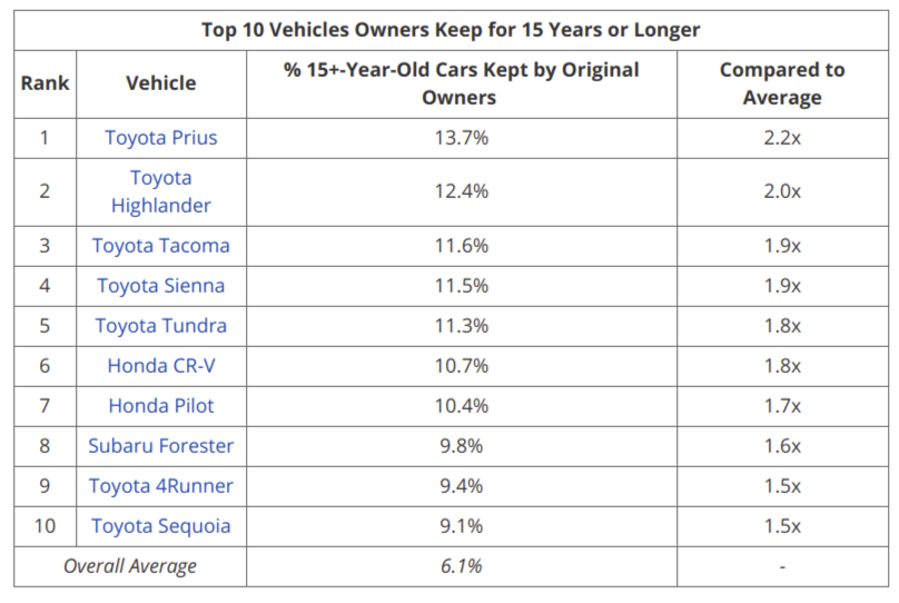 What is fascinating about having the Prius as the top vehicle that people keep for at least 15 years, given the sales dominance of trucks, SUVs and crossovers, is the testament to the life span of the hybrid battery's life. While some of these long-term Prius owners may have replaced their hybrid batteries, I would imagine a chunk of these cars are still running on the original battery. According to this report from Torque News, a salesperson who specializes in selling Toyota hybrids for a long time said that it's not uncommon for a Prius battery to last 10 to 15 years.