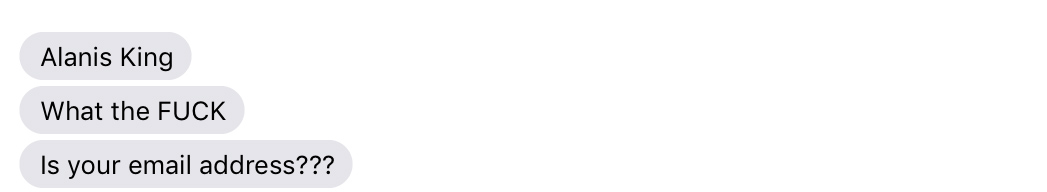 Here I am, watching "Alanis King" ... "What the FUCK" come across my computer screen, thinking, "Oh, God, what did I do now?"