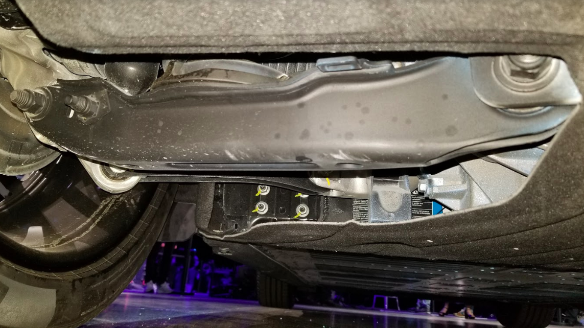 At the debut on Sunday, I slid under some Mach-Es to try to catch a glimpse of the hardware packaged in-vehicle, but I couldn't see much, as the entire underbody is covered in aerodynamic shielding. Still, the photos above and below show the Mach-E's independent rear multilink suspension with what looks like a stamped steel lower control arm, and you can see a bit of the drive unit's cast aluminum case towards the center of the axle.