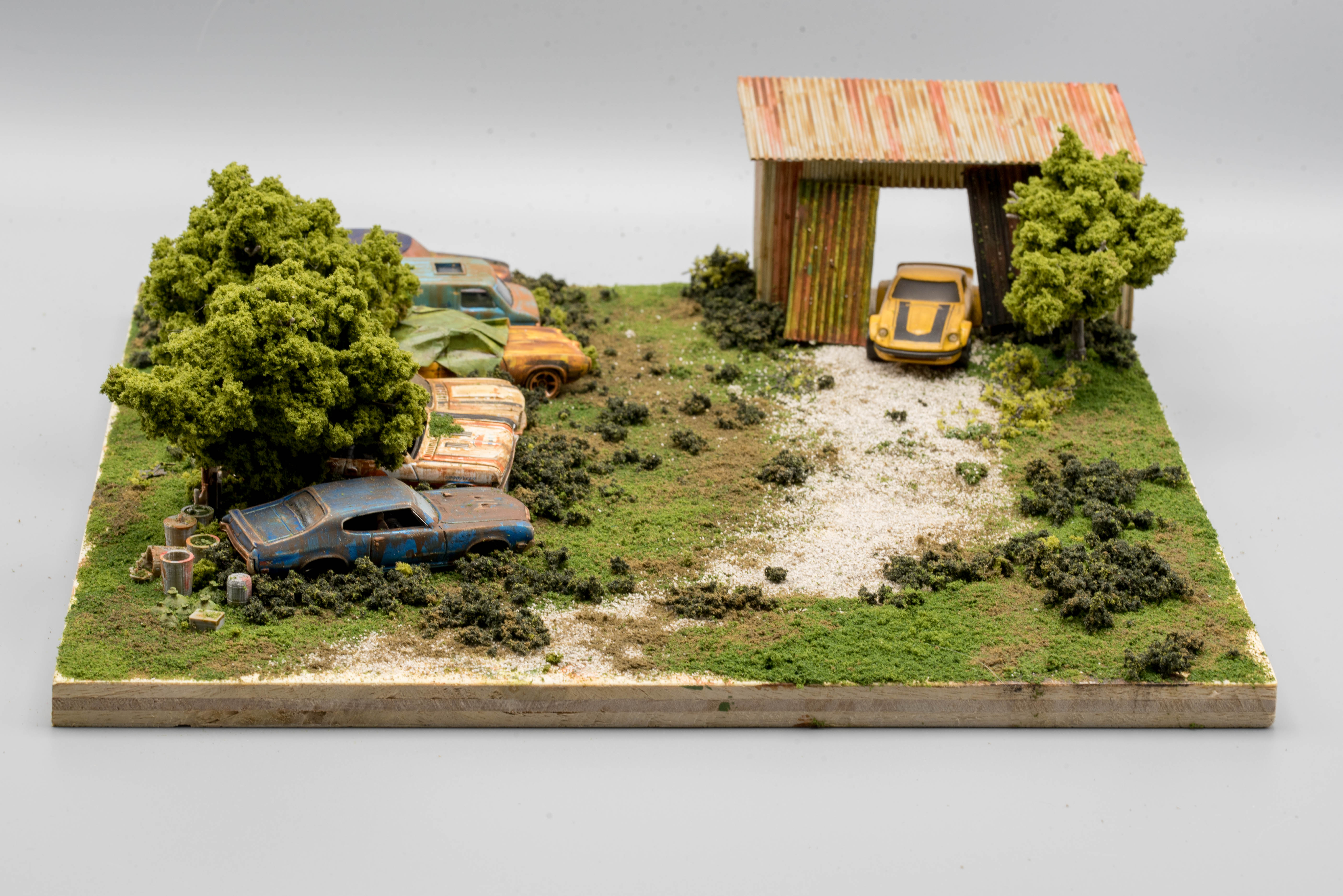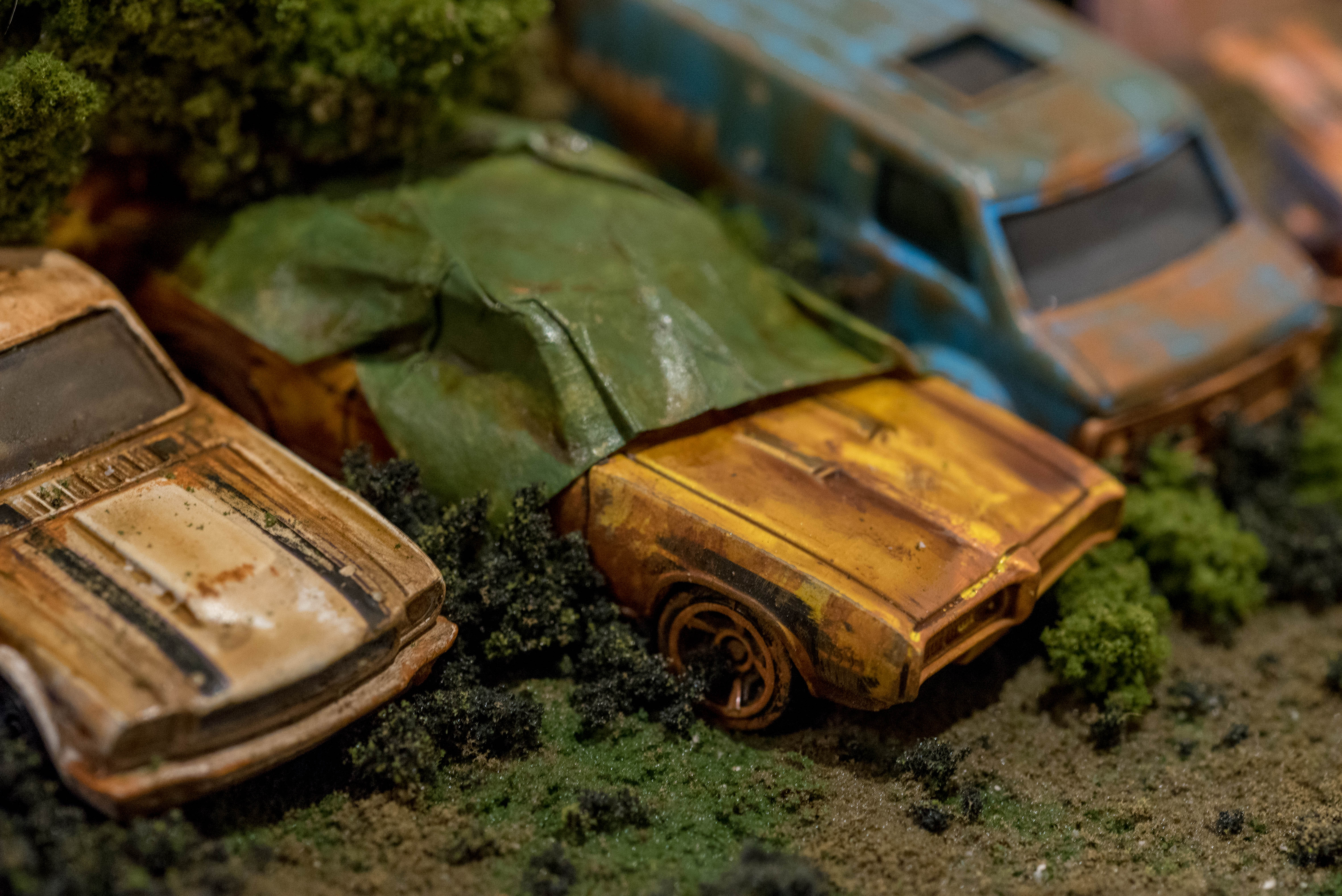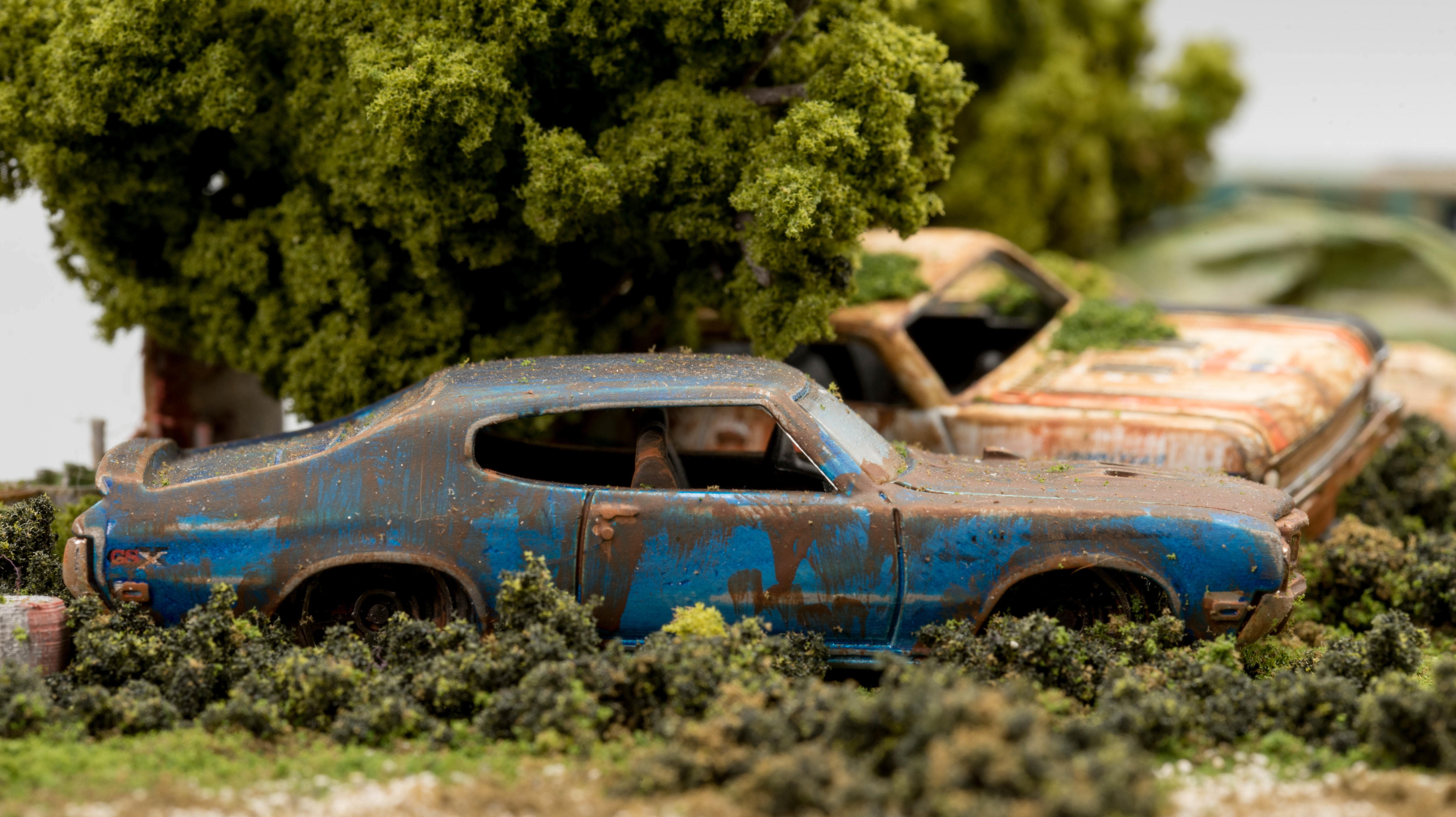 To help add visible aging, it can be worth considering painting over any chrome plated plastic with an opaque acrylic, just to help reduce the amount of toy-car shine left in the display. I also will drill out the rivets sometimes to pop the whole car apart, to take the glass and wheels out like the Nova below. In the case of the GTO above, the interior was fully shiny chrome and I was simply feeling lazy, so I made that tarp covering out of printer paper, which I painted, crumpled, used a wash on, and then shaped to the car while damp.
