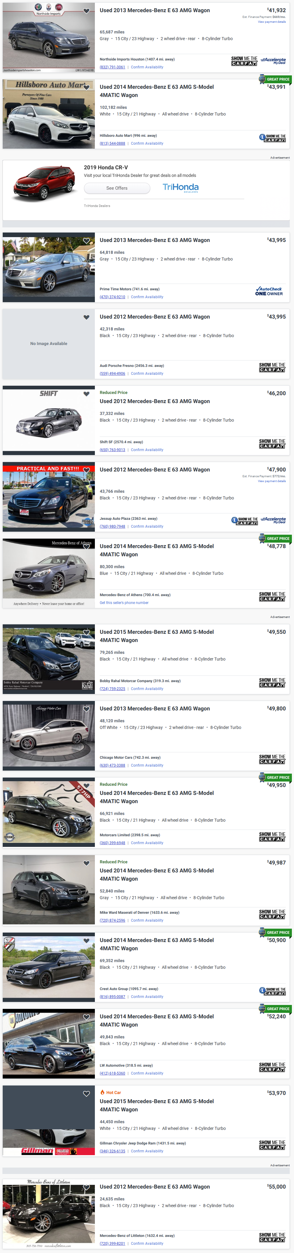 As of now Autotrader is listing around two-dozen E63 and E55 AMG wagons under the 60 grand mark, many of which have some fairly reasonable miles on them, like this one with just under 30,000 miles on the clock.