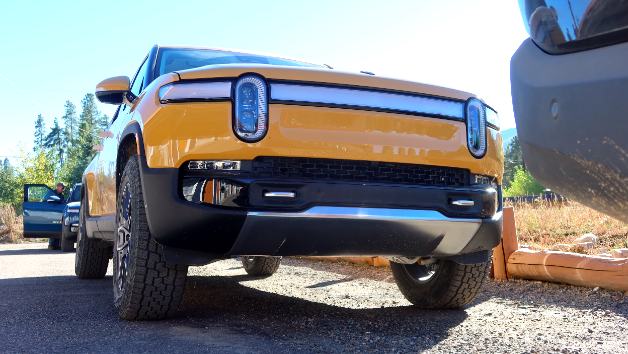 The Rivian is strongest in the most important off-road category, and it showed in the Colorado rockies where I drove a yellow R1T on the company's off-road course not far from Breckenridge. It was a scenic trail offering plenty of jagged terrain, steep grades, and slippery surfaces. The Rivian's 275mm-section Pirelli Scorpion all-terrains stomped all over the boulders, lifting the vehicle up and away from danger, keeping bumpers, rocker panels, and underbody components safe from damage.