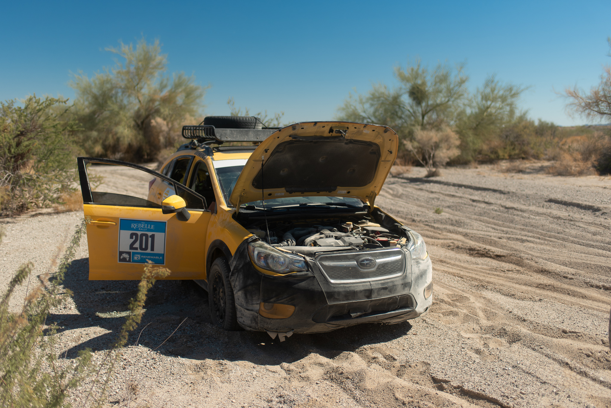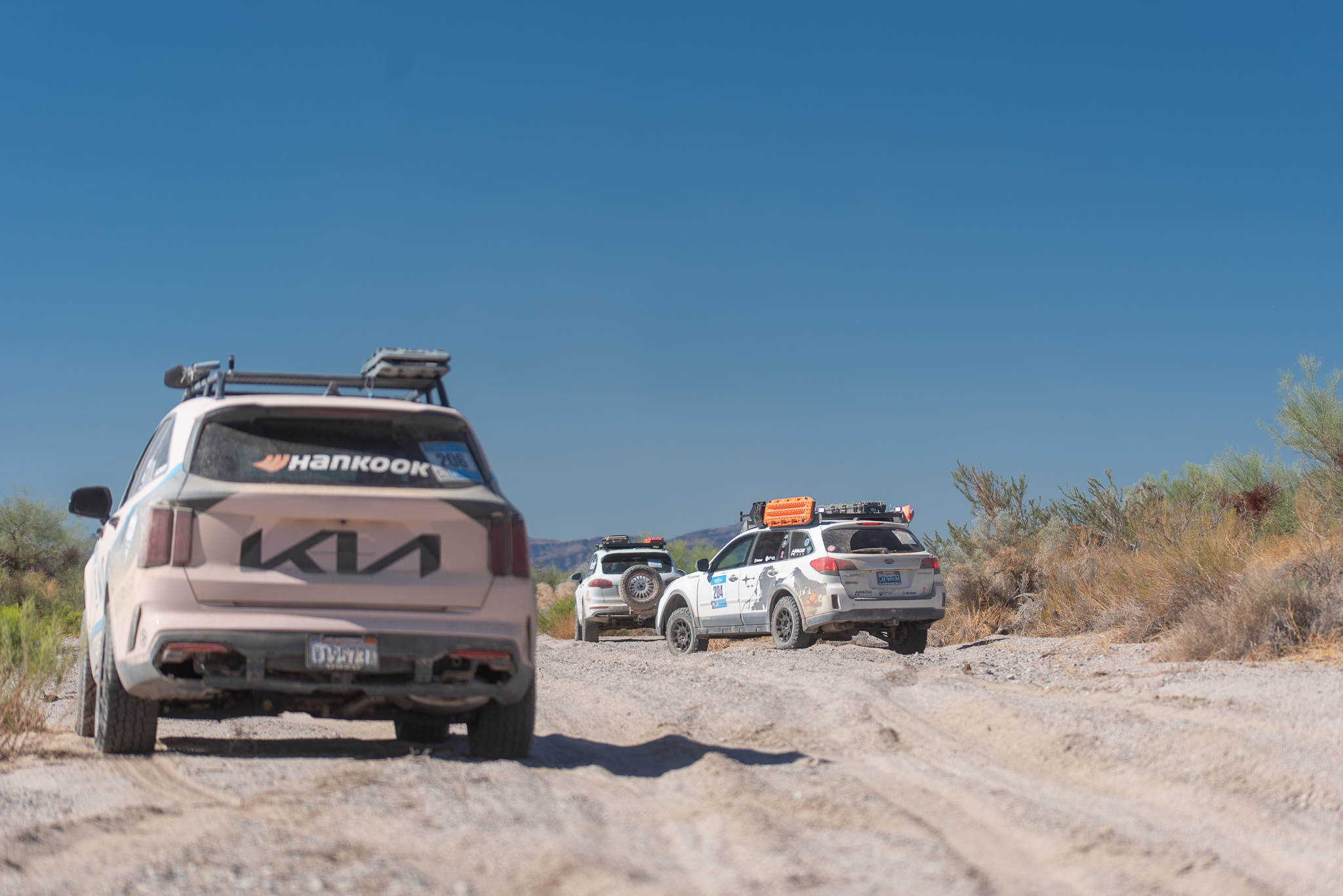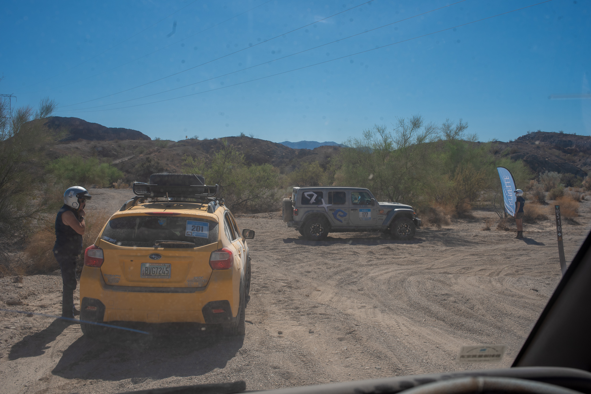 In the distance, I could see a medley of teams had all parked at a blue Rebelle flag indicating an optional checkpoint. The Crosstrek crested the hill and the team — Noelle and Lola, who I'd chatted with several miles back as we turned off the main highway and they regained their bearings — stepped out and surmised the situation. Noelle, kind as ever, came over and let me know that the next path they'd be taking was the uphill wash to our right, and if I was to keep following, I might want to consider airing down. The uphill wash comprised mainly of silt that seemed, well, basically the same as the bank of the Colorado I'd gotten stuck in not even six hours earlier.