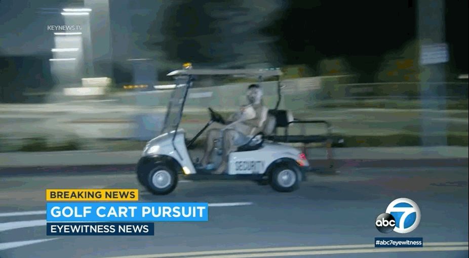 We've seen everything from stolen Rolls Royces to witnessing multiple carjacking attempts on live TV in southern California, though a chase last night might be one of the strangest yet. ABC7 reports a man with no shirt stole a golf cart and led police on a chase with his dog in his lap.