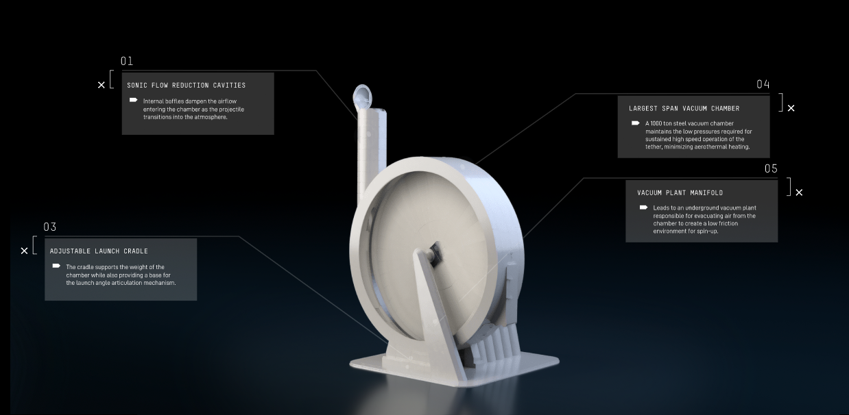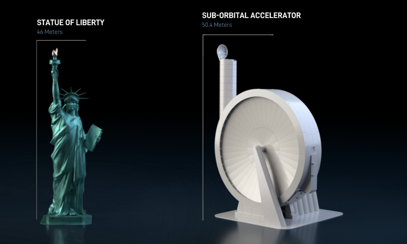 The Suborbital Accelerator is a huge vacuum chamber (i.e. there's no air to create aerodynamic drag) with a carbon fiber rotating-arm style centrifuge inside it. The arm spins the payload (which can include a second-stage rocket to potentially reach orbit) and then a high-precision mechanical release flings it out of that tube, where it then shoots out into space.